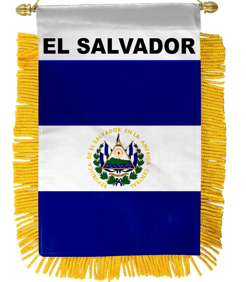 Flag measures 4 inches x 6 inches 100% Polyester flag Double-sided flag image with country name Gold plastic rod and suction cup hanger Gold fringe trim edging the flag 4x6 inch International Country Mini Banner
