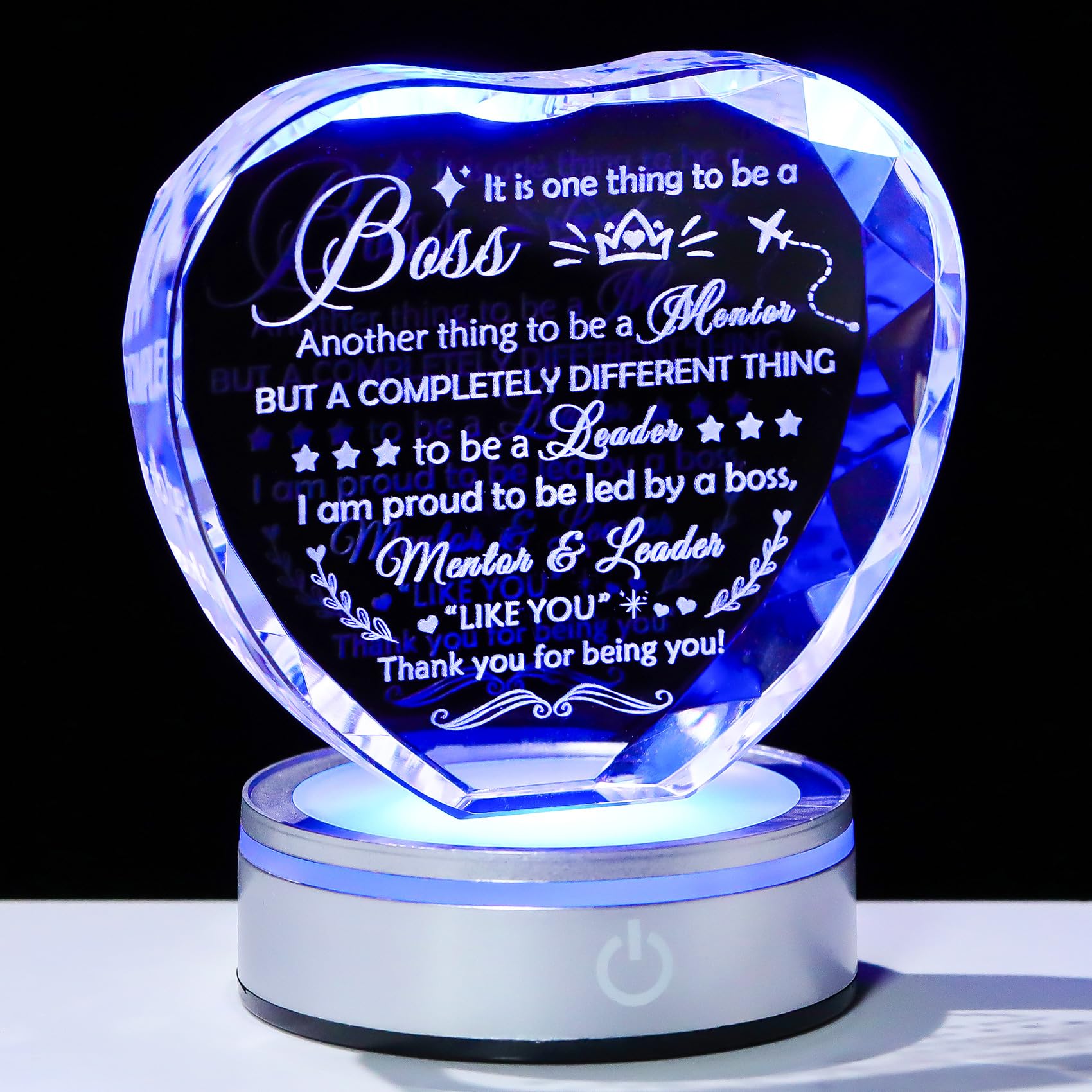 【Multicolor LED Illuminated Display】Featuring a 3.1x1.1-inch LED base with 6 color modes, this crystal plaque glows vividly to highlight the heartfelt laser-etched message: "It's one thing to be a boss... thank you for being you". Perfect as a nightlight or elegant desk decor. 【Forever-Lasting Laser Engraving Technology】Crafted with premium K9 crystal and advanced 3D laser etching, your meaningful tribute remains permanently flawless - no fading, peeling, or scratches. A timeless keepsake for bosses celebrating promotions, retirements, or farewells. 【Gender-Neutral Luxury Gift Set】Packaged in a sleek white gift box with satin lining, this unisex design suits both male and female bosses. Ideal for Bosses Day, Christmas, birthdays, or "thank you" occasions – ready to impress without extra wrapping. 【Dual-Purpose Thoughtful Keepsake】Balances professionalism and sentimentality: Display it as a leadership trophy in office cabinets, use it as a calming nightlight in bedrooms, or showcase it on shelves as a "World's Best Boss" statement piece. 【Universal Appreciation Symbol】Goes beyond job titles – honor mentors, leaders, and role models with a gift that says "You're irreplaceable". Perfect for coworkers, managers, or CEOs during promotions, holidays, new jobs, or retirement transitions. Equipped with a special LED lighting base with 6 Light Modes, the light color can be adjusted automatically, making the crystal colorful; the touch switch on the base is easy to use, you can use connect the power via a USB cable.Product Specification:Color of Crystal: ClearMaterial: K9 CrystalCrystal Size: 4.3*3.9"Base Size: 3.1*1.1"Box Size: 5.7*5.3*1.8"Total Weight: 1.69lbPackage Include1 x 3D Crystal Keepsake1 x LED Base1 x Data Cable1 x Nice Gift Box1 x Greet Card1 x Cloth Wipe1 x Specification