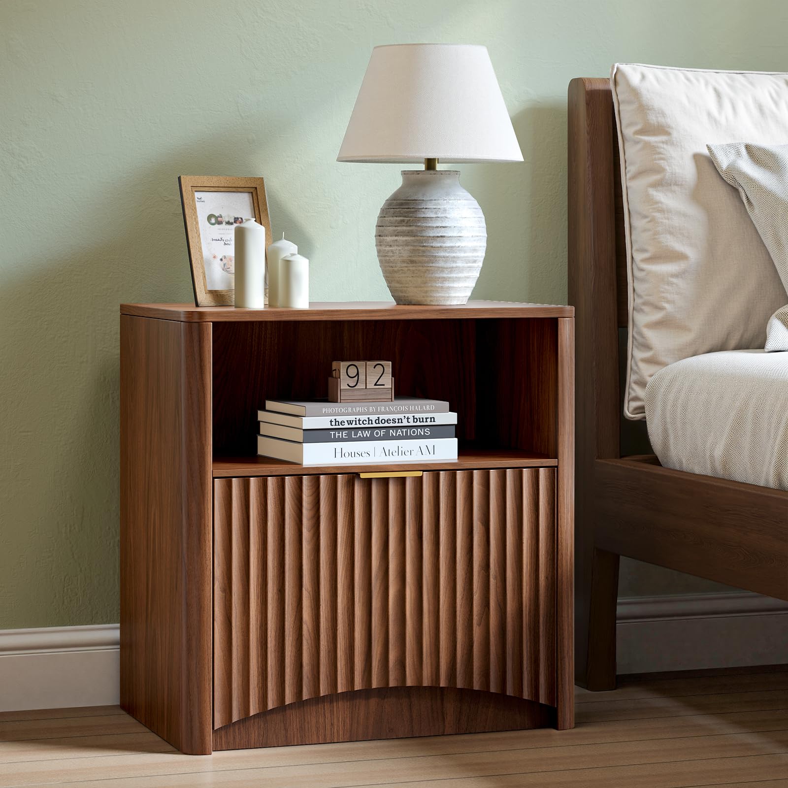 【Multi-scene Storage】This tall bedside table measuring 15"D x 22.8"W x 23.6"H; It serves as a walnut bedside table for bedroom, an end table for living room, and a small accent table for hallway, offering versatility without taking up much space 【Elegant & Stylish】Fluted panel and curved profile with gold handle combine style and function, making it a practical modern bedside table that fits perfectly in any space and brings the classic charm of a midcentury modern nightstand to your home 【Versatile Nightstand】This fluted nightstand with drawers combines an open upper shelf for easy access to essentials like books, with a lower drawer for concealed storage of personal items, offering a convenient solution for bedside organization 【Sturdy & Lasting】The natural wood nightstand offers stability and durability with its premium construction; its water-resistant surface resists daily wear, ensuring it remains a long-lasting addition to your home for storing and organizing essentials 【Easy Assembly】This mcm nightstand comes with clear instructions that guide you through the entire process; All parts are labeled alphabetically, making this walnut nightstand easy to identify each piece and ensuring a smooth, straightforward installation Discover our unique fluted nightstand, featuring a mid century modern design. It provides endless possibilities for decor and storage. Features: Type: Fluted Nightstand for Small Space Material: MDF Overall Size: 15""D x 22.8""W x 23.6""H Drawer Size: 13""D x 20.3""W x 6.3""H Weight: 35 lb Applicable scene: Bedroom, Living Room, Home Offices, Children's Room, Hallway Packing List: 1*nightstand, 1*user manual"