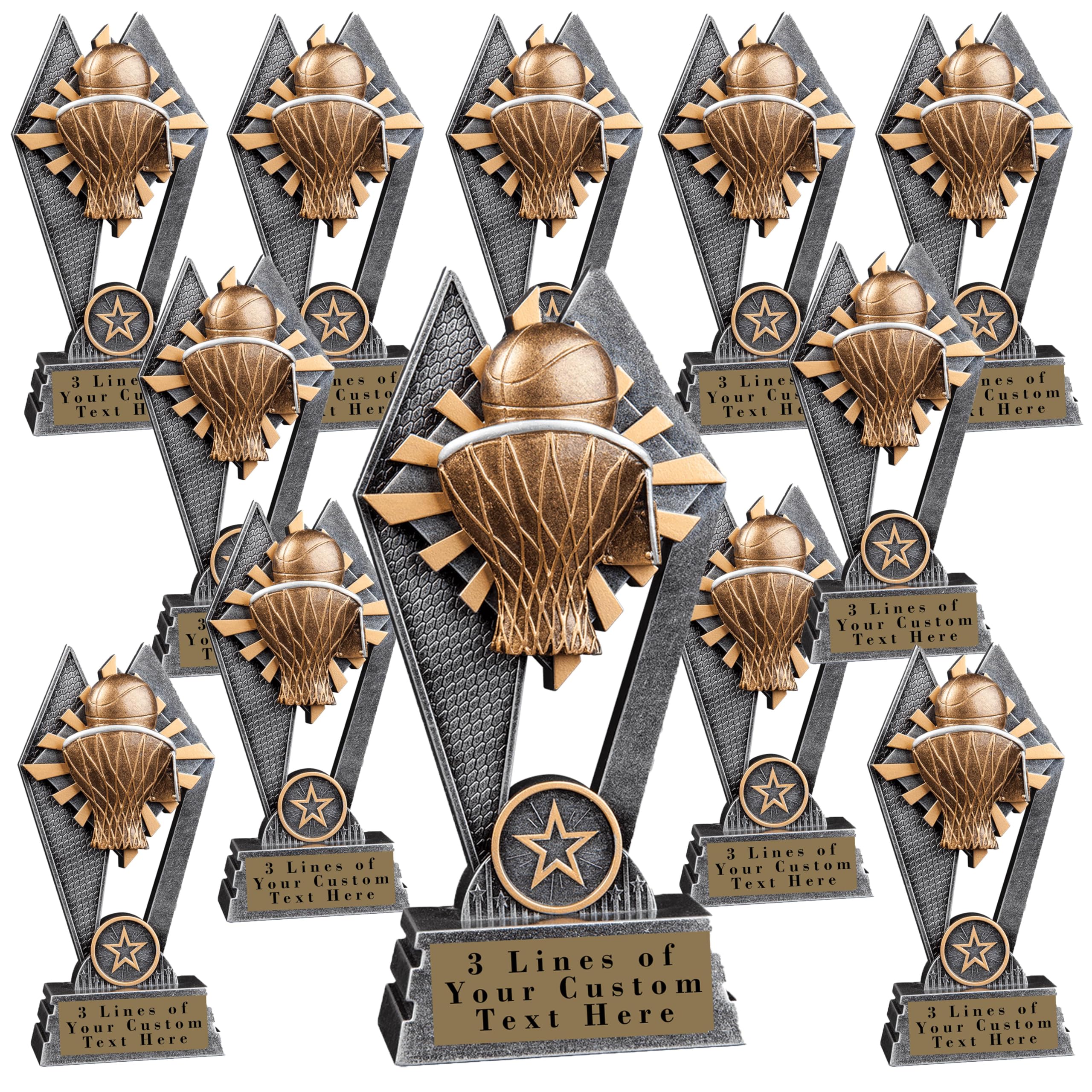 PERSONALIZE: If you do wish to enter different text for each trophy Please follow these steps. When prompted to enter your text, enter the words "SEE EMAIL" for all three lines. After you pay for your order, please send us a message with your order # and engraving details using any of the Contact Seller features on Amazon for the Seller Express Medals. Worst case we will send you a message in Amazon if we do not recieve your text, and you can simply reply to that message with your details ! NEED MORE THAN 12 Trophies? You can purchase from 1 to 11 additional trophies during the "CUSTOMIZE now" process of entering your engraving details. BULK VALUE: Pack of 12 identical trophies, ideal for entire Basketball teams, tournaments, or season-end celebrations. PROFESSIONAL APPEARANCE: Features a dynamic basketball-themed design with a metallic star emblem and textured background pattern. An award that you will be proud to present and the recipient will display proudly for years to come. QUALITY TROPHY: These Basketball Trophies are individually boxed and made of a heavy solid resin materail and measure a full 7" Tall. Still Have Questions..? Or need a different Basketball Trophy or Award Medal…? Just Click on the Blue Express Medals Link Above to Visit our Amazon Store Celebrate sporting excellence with these impressive unisex basketball soccer trophies that command attention and admiration. Each trophy features a dynamic design with a striking gold basketball motif set against a textured silver backdrop, creating a stunning burst effect that captures the energy of the game. Standing 7 inches tall, these awards make perfect recognition pieces for teams, tournaments, or individual achievements. The premium resin construction offers a sophisticated finish that catches and reflects light beautifully. The base includes space for three lines of custom text, allowing you to personalize each trophy with player names, achievements, or commemorative dates. A distinguished star emblem adorns the base, adding an extra touch of prestige. These trophies arrive ready to present, making them ideal for basketball leagues, school sports programs, or special athletic events. This pack of 12 ensures you have enough awards to recognize every valuable player on your team.