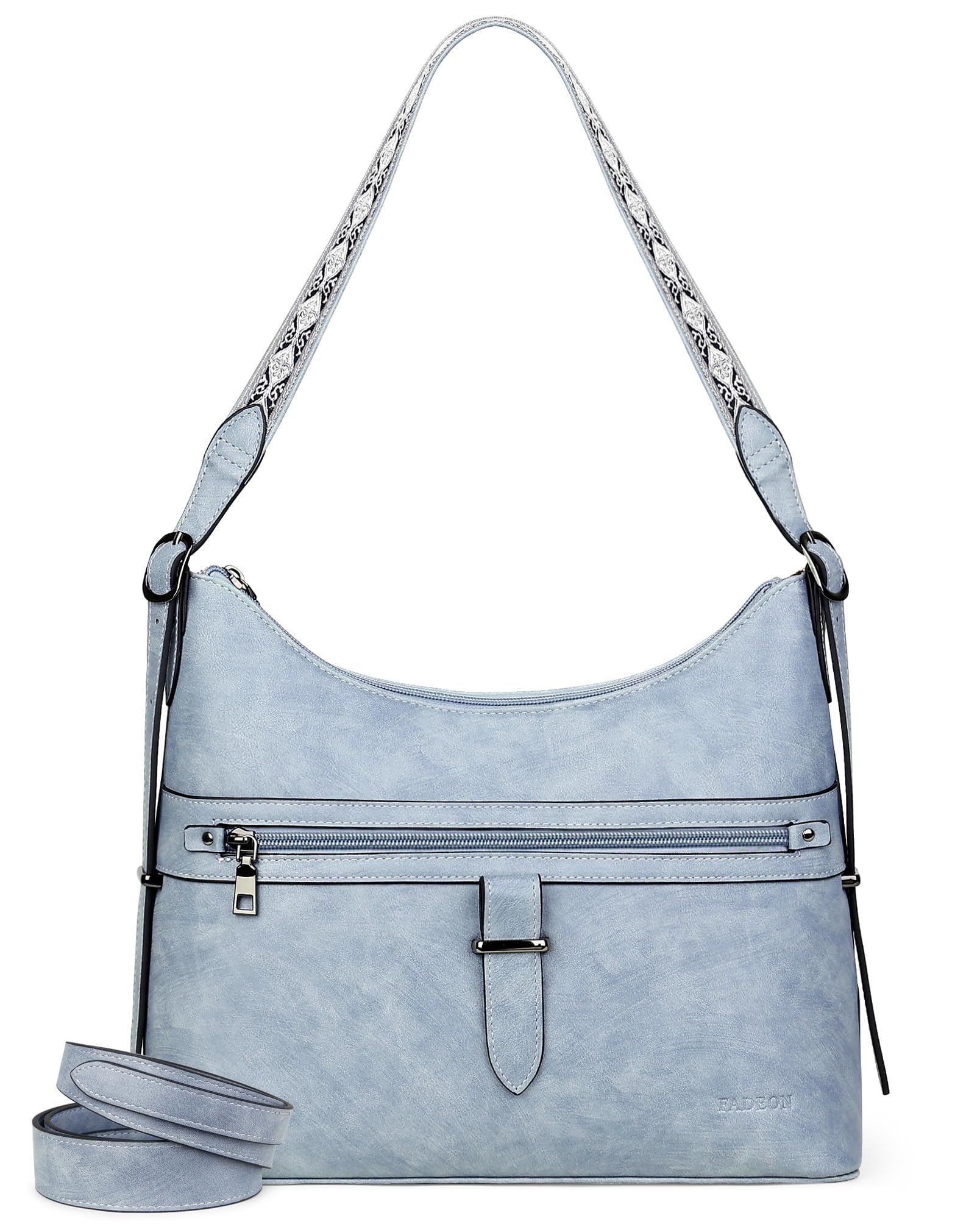Design Hobo Bag: This hobo purse is a foldable soft bottom design and stands upright well with It without anything. This women's purse have 2 removable straps. The short strap allows you to transform the hobo bags into shoulder purse or handbag, and a long strap that can convert the hobo purse into a crossbody purse. Multiple color available for you to choose from, and the curved structure of the crossbody bag is tailored to the body, making it more convenient and comfortable to use. Large Capacity Crossbody Purse: Measuring 12.5''W*4"D*9''H, it weighs 2 lb, making it a lightweight women crossbody handbag. It features 8 pockets, including 2 main compartments, 1 front zip pocket, 1 back zip pocket, 2 internal zip pockets, and 2 internal slide pockets, providing ample space to meet your daily needs. This hobo purse allows you to neatly store an 11-in iPad, A5 fire, a smartphone, a power bank, a wallet, cosmetics, and other daily essentials. Crossbody Purse: This women's crossbody bag is crafted from premium vegan leather and intricately hardware. It is effortless to clean, simply wipe it with wet cloth. The zippers have has been tested many times, and the effortless and smoother operation. Premium quality hardware on both sides makes this shoulder purse look more stylish and practical. This enables hobo purses for women to better accompany you, liberate your hands, and transform into a fashionable accessory. Multifunction Present:The hobo crossbody purse embodies simplicity, elegance, and style. This leather hobo bag for women is ideal for a variety of activities, such as shopping, working, traveling, dating, and partying. Moreover, cross body bags makes an outstanding present for special occasions like Mother's Day, wedding anniversaries, New Year celebrations, Christmas, and birthdays. After-Sale Service: All FADEON products are manufactured in our own factory, ensuring guaranteed quality. Should you have any inquiries or suggestions regarding the product, please do not hesitate to contact us via email. We possess the capability to provide you with the optimal solution. Therefore, we highly recommend this leather hobo crossbody bags for women as an excellent choice for either yourself or your loved ones! A practical hobo purse can solve many of your problems. Soft and waterproof PU leather material releases your life. Premium hardware shows your pursuit and positioning of premium life when you use this crossbody purse. The structure of the whole tote handbag is designed with a smooth moon-shaped opening, which makes it very smooth and convenient to use the zipper to take or bring things. The size of this hobo bags for women is convenient for us to place daily necessities, such as 11-inch iPad, A5 files, notebooks, Kindle, mobile phones. Considering our small items: keys, headphones, cosmetics, glasses, we also designed a zippered compartment in the middle. The multi-pocket structure also allows you to place and find items more conveniently. It is practical without losing its design sense. We use wood grain leather and pay attention to the details to make you feel good when you use it. This bag can also be a fashion item. Therefore, we designed 9 straps for free conversion. The short strap is designed with jacquard ribbon of the same color system to enhance the overall coordination, and the color and pattern reflect elegance, intellectuality and fashion. The long strap is widened to make your shoulders bear most of the weight comfortably when you use it. The hobo crossbody bags for women‘s design of long and short straps makes this purse not only an hobo bag, but also a shoulder bag or a cross body bag. Such an excellent practical and fashionable bag adds fun to your life quality and can also be a gift for her.