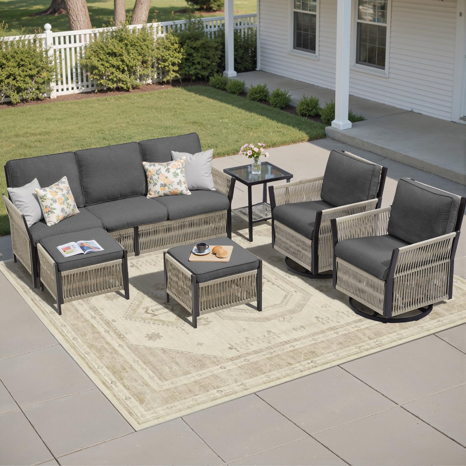 6 Pieces Patio Furniture Set: Contains 2 swivel chairs, 2 ottomans, 1 side table and 1 sofa, a total of 3 package, creating a perfect combination for your outdoor space. Built-in assembly instructions and accessories help you assemble quickly. Unique Rattan Rope Design: This wicker outdoor furniture adopts exquisite craftsmanship to cleverly combine imitation rattan rope with exposed metal tubes, while also showing the pursuit of modern aesthetics. Unlike the classic full-width rattan design, this outdoor seating furniture is more stylish and modern. Ergonomic Design for All-day Comfort: This patio furniture set with swivel chairs features an innovative outward-leaning armrest design and high backrest, which effectively expands the seating space while providing soft and comfortable support. Ideal for taller or larger people, allowing for different sitting positions. 360° Swivel & Rocker: The wicker swivel rocker patio chairs have a sturdy metal base, which can achieve a smooth and gentle 360-degree rotation movement and forward and backward sliding, adding fun and joy to your outdoor leisure time. Comfortable Seating: The outdoor cushions are made of olefin fabric, which provides 800 hours of UV protection and waterproof performance. And the seat cushions are made of 4-inch thick high-resilience foam, which is not easy to deform and provides ample support for your body. Sturdy Constructions: This outdoor patio furniture set clearance uses a sturdy metal frame, wrapped in hand-woven rattan, and treated with a special waterproof and anti-aging coating, which is enough to withstand various weather changes and extend its service life. Multifunctional Side Table: This rattan side table is made of tempered glass, which is easy to clean and heat-resistant. Plus, it has 2-layer storage space for easy access to necessities, allowing you to enjoy a relaxed and comfortable lifestyle. After-sales service: