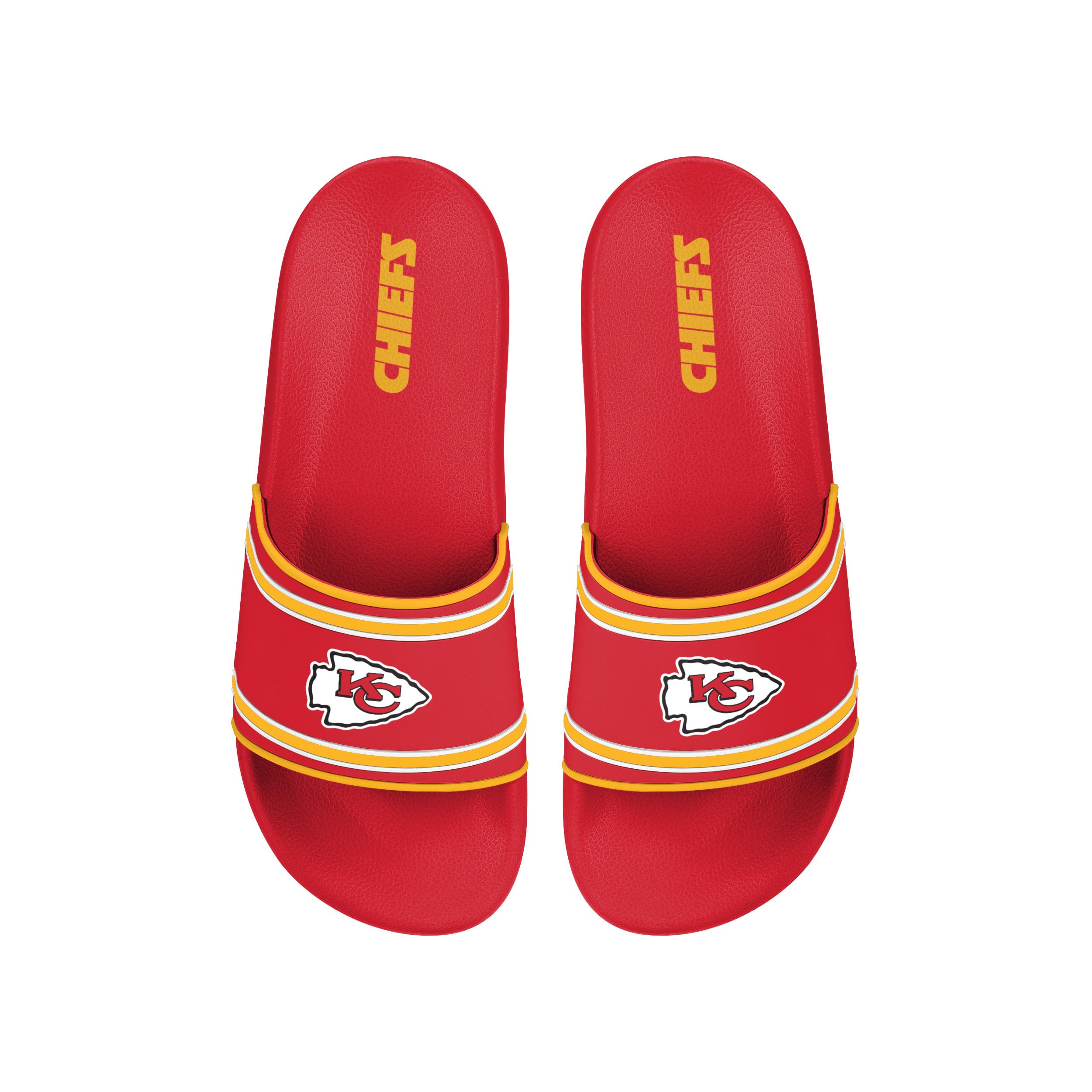 OFFICIALLY LICENSED BY THE NFL – Genuine Kansas City Chiefs merchandise featuring official team colors and logos. BOLD TEAM LOGO & WORDMARK DESIGN – Large Chiefs logo on the strap with printed team wordmark on the heel for unmistakable fan flair. MEN’S SIZING FROM S–XL – Choose from Small (7-8), Medium (9-10), Large (11-12), or X-Large (13-14) for a comfortable, secure fit. TEAM COLOR STRIPE ACCENTS – Iconic Red with team color & alternate stripe accents for a sharp, athletic finish. PREMIUM EVA CONSTRUCTION – Lightweight and durable Ethylene Vinyl Acetate material offers water resistance, comfort, and long-lasting wear. FOCO NFL MEN'S OFFICIALLY LICENSED SPORTS SLIPPERS PRIMARY LOGO TEAM COLOR STRIPE MOLDED FOOTBALL SLIDES - Slide into unbeatable comfort and team pride with the FOCO NFL Kansas City Chiefs Men’s Officially Licensed Primary Logo Team Color Stripe Slides. Whether you’re relaxing at home, heading out to a tailgate, or recovering after a workout, these slides are the perfect combination of comfort, durability, and fan-first design. Featuring the iconic Kansas City Chiefs logo boldly embroidered on the strap, and the team’s wordmark printed on the heel of the footbed, there’s no mistaking where your loyalty lies. The clean Red team color with red and white accent striping delivers a sharp, sporty look that pairs perfectly with your game day outfit or casual wear. Built from lightweight and water-resistant Ethylene Vinyl Acetate (EVA), these slides are as practical as they are stylish. A cushioned molded footbed provides all-day comfort and support, while the flexible sole grips any surface with ease. Whether you're at home, at the pool, or out showing off your team spirit, these Chiefs slides get the job done. Slides are available in men’s sizes Small to X-Large: Small (7-8), Medium (9-10), Large (11-12), X-Large (13-14) — making them a great gift or personal pick-up for any die-hard Chiefs fan.