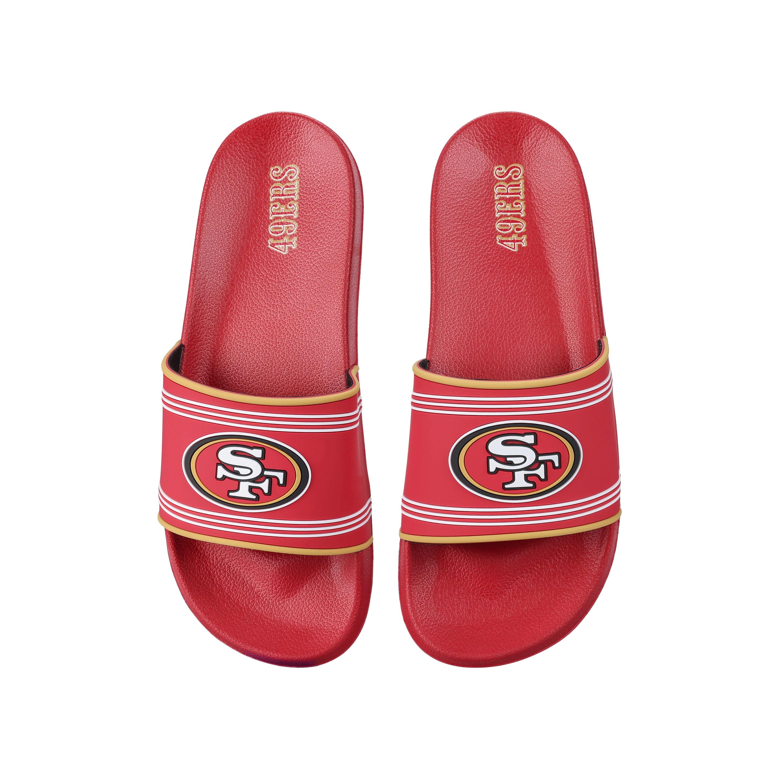 OFFICIALLY LICENSED BY THE NFL – Genuine San Francisco 49ers merchandise featuring official team colors and logos. BOLD TEAM LOGO & WORDMARK DESIGN – Large 49ers logo on the strap with printed team wordmark on the heel for unmistakable fan flair. MEN’S SIZING FROM S–XL – Choose from Small (7-8), Medium (9-10), Large (11-12), or X-Large (13-14) for a comfortable, secure fit. TEAM COLOR STRIPE ACCENTS – Iconic Red with team color & alternate stripe accents for a sharp, athletic finish. PREMIUM EVA CONSTRUCTION – Lightweight and durable Ethylene Vinyl Acetate material offers water resistance, comfort, and long-lasting wear. FOCO NFL MEN'S OFFICIALLY LICENSED SPORTS SLIPPERS PRIMARY LOGO TEAM COLOR STRIPE MOLDED FOOTBALL SLIDES - Slide into unbeatable comfort and team pride with the FOCO NFL San Francisco 49ers Men’s Officially Licensed Primary Logo Team Color Stripe Slides. Whether you’re relaxing at home, heading out to a tailgate, or recovering after a workout, these slides are the perfect combination of comfort, durability, and fan-first design. Featuring the iconic San Francisco 49ers logo boldly embroideRed on the strap, and the team’s wordmark printed on the heel of the footbed, there’s no mistaking where your loyalty lies. The clean Red team color with Red and white accent striping delivers a sharp, sporty look that pairs perfectly with your game day outfit or casual wear. Built from lightweight and water-resistant Ethylene Vinyl Acetate (EVA), these slides are as practical as they are stylish. A cushioned molded footbed provides all-day comfort and support, while the flexible sole grips any surface with ease. Whether you're at home, at the pool, or out showing off your team spirit, these 49ers slides get the job done. Slides are available in men’s sizes Small to X-Large: Small (7-8), Medium (9-10), Large (11-12), X-Large (13-14) — making them a great gift or personal pick-up for any die-hard 49ers fan.