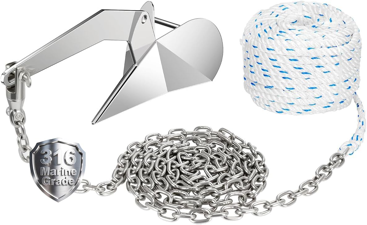 All-in-One Solution for Boat Anchor: This boat anchor kit set include: 316 Stainless Steel Delta Anchor 9 Lb / 4 Kg; 1/2" Anchor rope 100ft; 1/4" 316 Stainless Steel Anchor Chain 10ft; Two Section 316 Stainless Steel Marine Grade Anchor Chain Swivel Strong and Sturdy Material Build to Last: Delta anchor, HT G43 short-link chain, swivel connector made of 316 stainless steel, marine grade, corrosion-resistant, wear-resistant, and durable, ensuring your long-term use. 3-strand nylon rope -Nylon is the best materail for anchor line, is ultra strong with a higher tensile strength than other materials Delta Anchors Have the Best Grip: One-piece design Delta Style boat anchors can generate high holding power compared to other styles of anchors, like Fluke Anchor, keeps the boat stable even in high tide and strong wind conditions Windlasses Rode Combination Rope/Chain/Swivel, Designed for Use with Windlasses: Compatible with a wide range of marine windlass brands that accept 3-strand nylon rope. To determine your required chain and rope size, refer to your windlass manual Wide Application: Whether you own a pontoon, center console, deck boat, or sailboat, this delta-style anchor system ensures quick gripping and reliable holding power in nearly all bottom conditions, including sand, mud, pebbles, rocks, grass, clay, gravel, kelp, and coral. Great for use in lakes, rivers and coastal waters. 9 lb/4kg Delta Anchor for 13-20 FT Boats ALL-IN-ONE BOAT WINDLASS ANCHOR KIT: This anchor kit includes delta anchor, nylon rope, G4 chain, and Anchor Swivel - everything you need to secure your boat. This anchor kit is perfect for pontoon boats, fishing boats, center consoles, and sailboats. The delta anchor provides exceptional holding power in various seabed compositions, including mud and sand. ENHANCED ANCHORING PERFORMANCE: The 316 stainless steel chain adds weight and stability, ensuring your anchor operates effectively and maintains the proper scope for maximum holding strength. WEATHER-RESISTANT STRENGTH: Constructed from premium 3-strand nylon, this anchor rope is engineered to endure harsh conditions. RELIABLE HARDWARE: This kit includes 316 stainless steel Anchor Swivel, offering exceptional corrosion resistance and strength. Rest easy knowing your anchoring system is built to withstand the test of time. Notes: The choice of anchor is affected by factors such as the type and weight of the vessel, the sailing environment, and the type of seabed. Please choose the appropriate anchor according to your actual needs.