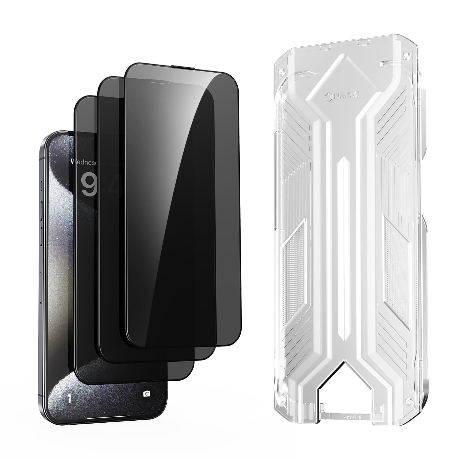 [💎9H+ Hardness Protection]FUNCAT screen protector features 9H+ hardness and an oleophobic coating to resist scratches/drops/daily wear. The anti-fingerprint layer keeps your screen clean and clear, while the shock-absorbing design ensures your phone stays safe from cracks. [🔒Privacy Protection]Blocks side views at 23° angles,with dual-sided privacy technology, keeping your data safe from prying eyes.99% HD clarity and ultra-smooth touch, zero lag for gaming and scrolling,offers a true naked-screen feel. [👍Auto Positioning–Bubble-Free Precision]Our reusable applicator ensures perfect alignment and bubble-free installation in seconds.Easy to use, even for first-timers – just place,peel,and press! [📱Headset Coverage Design]Full Coverage Screen Protector.No opening on the top. The screen protector shields your device from dust&liquid damage. But not affects the volume.Perfectly adapts to all kinds of phone cases. [💨Auto Dust Removal Tape] Pull out the tape, all dust comes out and the screen protector automaticlly adhere to the screen. Please watch the Installation video tutorial before your application. FUNCAT Privacy screen protector designed for iPhone 15 Pro Product Includes:3*Cell Phone Privacy Protector,1*Auxiliary Film Cell Phone Case,1*Film Installation Tool kit (with installation video.) "FUNCAT GLOBAL 3 PACK Privacy Screen Protector,shield your phone from scratches, cracks, and daily wear with our 9H+ hardness tempered glass. Featuring auto-alignment technology, installation is dust-free and bubble-free – even for beginners. Each pack includes 3 Pack Privacy screen protectors and installation kit. Why Choose FUNCAT? Privacy Protection: Blocks side views on 2 sides, keeping your data safe in public. Full-Coverage Design: Precision-cut edges ensure perfect fit for iPhone. Military-Grade Durability: Tested to withstand 20,000+ scratches and drops. Crystal-Clear Clarity: Anti-glare coating reduces eye strain without sacrificing brightness. Upgrade your screen protection with FUNCAT – the longest-lasting privacy armor for your device!