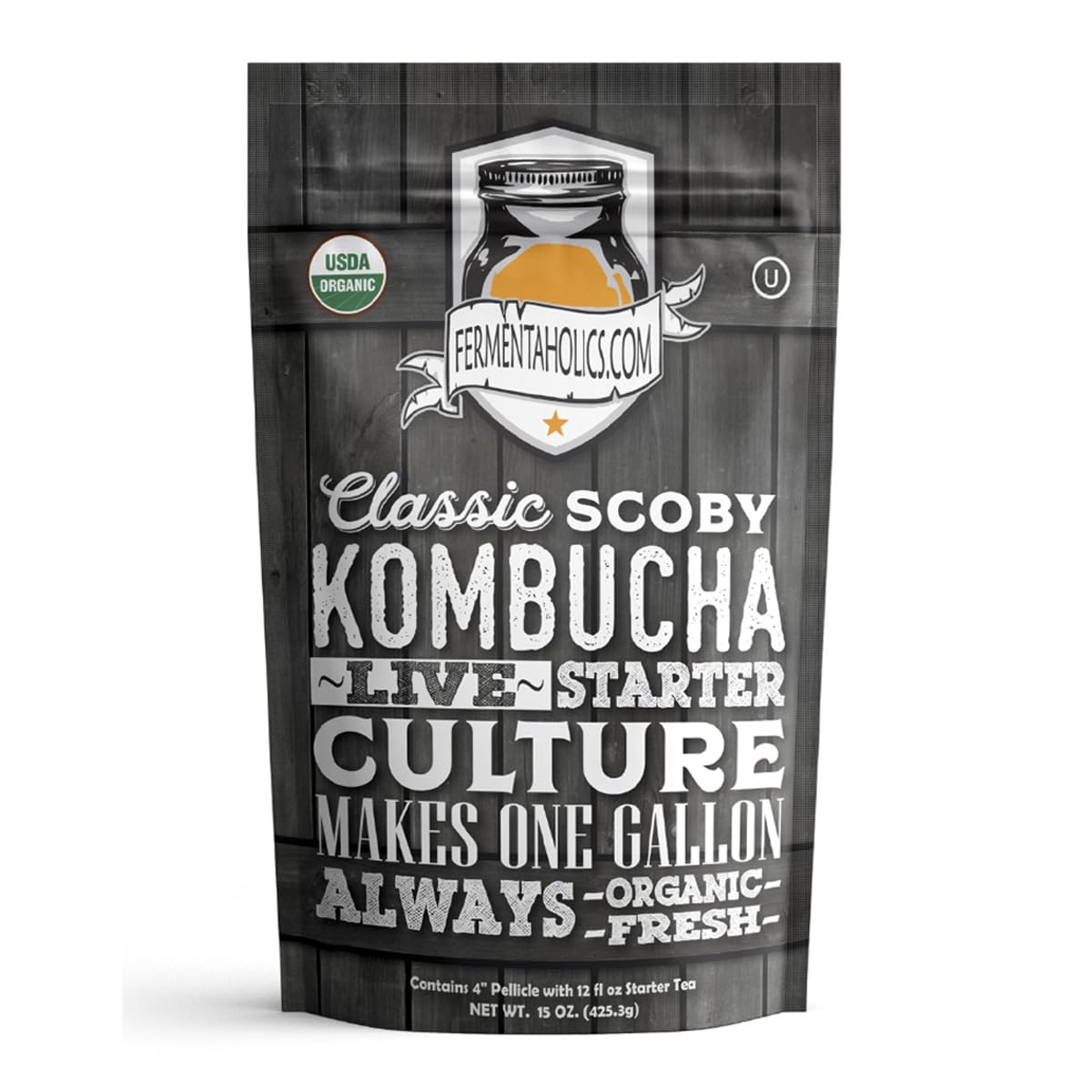 ★ USDA CERTIFIED ORGANIC SCOBY ★ Our cultures are Organic & Kosher, grown in our fully licensed lab. Quality is our priority! ★ BREW WITH CONFIDENCE ★ Our easy instructions guide you step by step through your first fermentation. If you have questions, we are here and happy to help! ★ MAKES ONE GALLON ★ You will receive 1.5 cups of strong, mature liquid starter tea packaged with a starter pellicle. This is the perfect amount to start you first gallon of kombucha at home. After that, if properly cared for, you can brew for a lifetime! ★ CREATE, LEARN, GROW ★ Get creative with new flavoring ideas and brewing techniques. Invite your friends over for a flavoring party or teach your kids a lesson in biology. Makes for a great gift for your favorite project loving friend. ★ MOST SUSTAINABLE OPTION FOR KOMBUCHA LOVERS ★ Eliminate the need for single-use bottles and energy involved in store-bought kombucha production. Save money AND help reduce your footprint! Organic Kombucha SCOBY with Starter Tea – Makes 1 Gallon This USDA certified organic SCOBY comes with 1.5 cups of strong, mature starter tea—just the right amount to begin brewing your first gallon of kombucha at home. Our cultures are organic, kosher, and vegan. The included instructions walk you through each step of the fermentation process, and if you run into any questions, support is available. Once your brew is going, you can keep it going batch after batch if you care for the culture properly. It’s a simple way to cut back on single-use bottles, save money, and enjoy experimenting with your own flavors. It also makes a great gift for anyone who enjoys hands-on projects or learning something new.