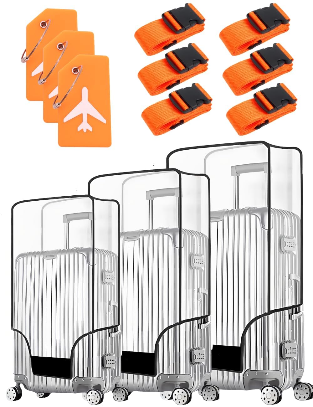 【Suitcase Protector Cover Tsa Approved】You will receive 3 pieces of Suitcase cover(20"+24"+28"), 6 pieces of luggage straps and 3 pieces of silicone luggage tags with name ID cards, good combinations and sufficient quantity for you to use and replacement while traveling or going on a business trip, bringing you more convenience to take your luggage. 【Protect Your Suitcase & Personal Belongings】The luggage cover is made of PVC material which can prevent scratches to your suitcase. Also can effectively block water and dust, keep luggage dry and clean. Luggage straps are made of encrypted and thickened polypropylene, Width: 2inch, can tie the luggage well, prevent luggage from being scattered during the check-in process. 【Quickly Identify Your Suitcase】Write your name on the label card to remind others not to take the wrong luggage, even if the luggage is lost, the staff can contact you according to your contact information. Brightly colored luggage tags for travel help you quickly find your suitcase among the bulk of luggage. 【PVC Suitcase Cover Set】Keep luggage away from scratched, stained, messy or ruined, luggage accessories suit for 20", 24" and 28" wheeled suitcase, jeep luggage, hard sided luggage, kenneth cole suitcase etc,carryon cover clear. 【Clear Suitcase Cover Size】20'' Suitcase cover: 17.7''H x 14.5''L x 9.8''W, 24'' Suitcase cover: 22.4''H x 17.3''L x 11''W, 28'' Suitcase cover: 23.6''H x 19.7''L x 11.8''W. Foldable design for easy storage. Pls make sure your Suitcase size before place the order. Features: