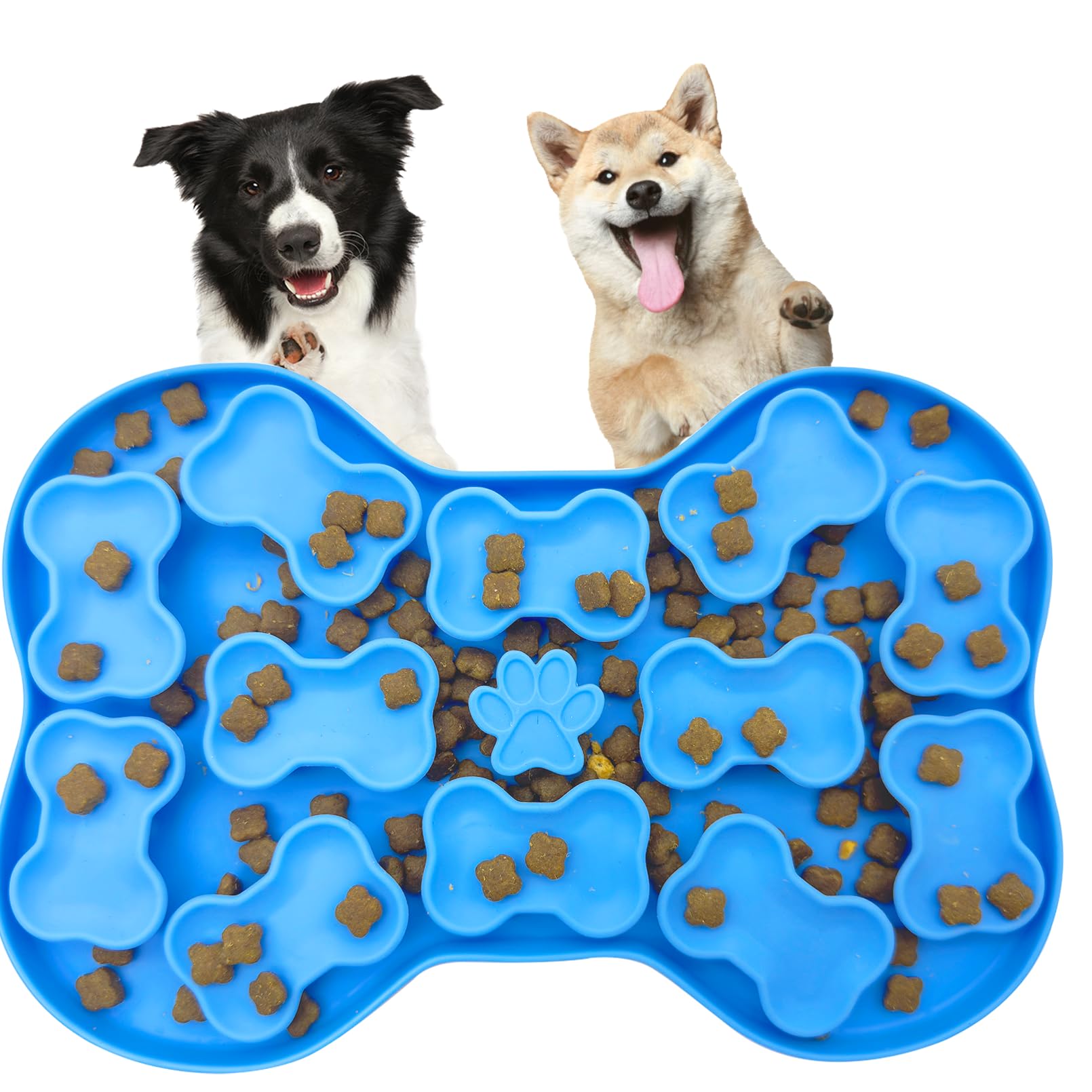 Silicone dog foraging mat: Silicone slow feeder mat that is both safe and durable, easy to clean, and dries quickly; can be hand washed or put in the dishwasher Cute Bone-Shaped Design: Both the overall appearance of the mat and its raised patterns are crafted in a bone shape, adding a touch of cuteness to your pet's feeding area Enhance the sense of interaction: Can encourage the dog to participate in fun food-seeking adventures with a dog snuffle mat, enhancing its sense of smell; slows down the dog's eating speed, promoting healthy eating habits Bottom suction cup design: Multiple suction cups at the bottom provide strong adsorption, ensuring the puzzle feeder dog mat will not move, reducing friction, and protecting the floor All kinds of food can be put: Suitable for all types of dry food and wet food, can also be spread with peanut butter or other dog-friendly food on the versatile dog lick mats Size: The size of our dog treat puzzle is 9in (L) x 6in (W) x 0.4in (H), perfect for small to medium-sized dogs; However, it can also be enjoyed by cats, rabbits, ferrets, and other small pets