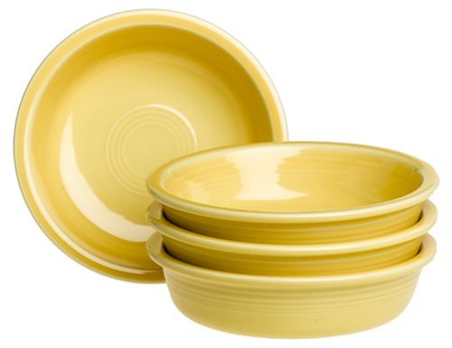 Set of 4 medium-size 19-ounce bowls Chip-resistant vitrified china provides enhanced durability Lead-free, nonporous glazing in festive colors for fun mixing and matching Safe in the freezer, oven, microwave, and dishwasher Signature Fiesta concentric rings; ideal for serving soup, salads, or dessert