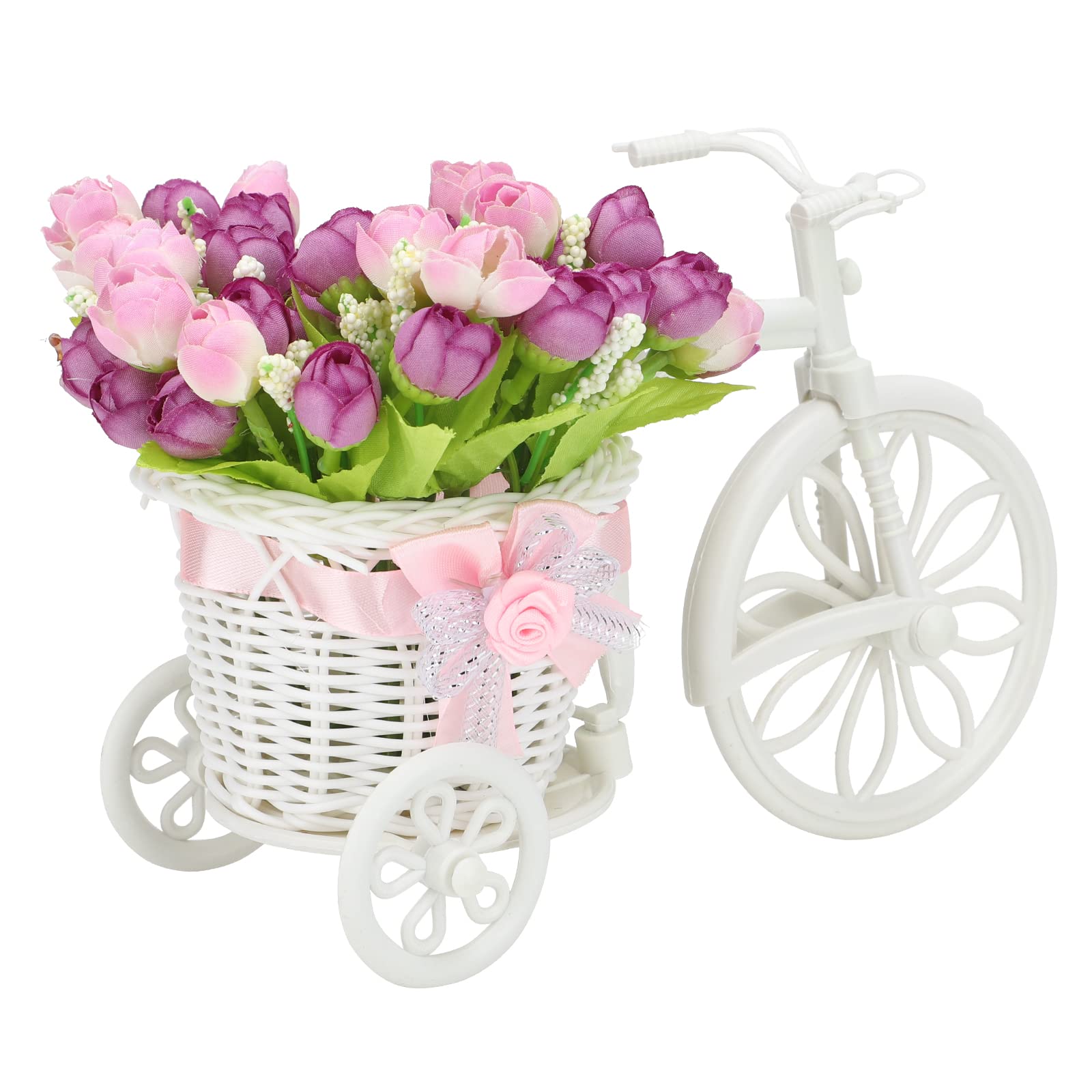 WHAT YOU WILL RECEIVE: You will receive a rattan bicycle with 3 bouquets of roses, the dimensions of the bicycle are approximately 24.00 x 16.00 x 11.00 cm / 9.45 x 6.3 x 4.33 inches, the flowers are available in red, white, yellow, Pink, purple and several different colors, you can buy according to your favorite. ELEGANT DESIGN: The combination of rattan mini tricycle and artificial flowers makes the whole decoration a beautiful landscape. Showing youthful vigor will surely catch your eyes. DURABLE MATERIAL: Tricycle is woven from artificial rattan and artificial flowers are plastic. They will not be easily damaged and withered, and will retain bright colors forever. WIDE RANGE OF USES: Bicycle artificial flower decoration are very suitable for wedding, coffee shop, home, hotel, restaurant, table decoration. BEAUTIFY YOUR HOUSE: It helps beautify your house or office, ideal for garden decoration, theme decoration and DIY. Features: