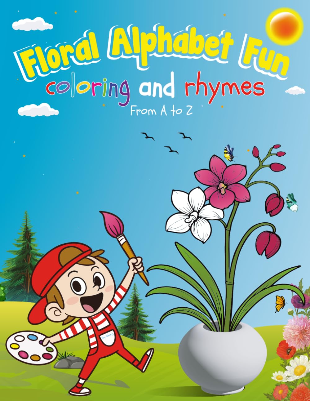 Floral Alphabet Fun: Coloring and Rhymes A to Z is more than just a coloring book . It is a fun and soothing adventure through the alphabet with flowers along to keep you company and two sweet companions, Rilo and Rivy , by your side. Lovingly designed by Hue Whimsy , this early learning activity book is meant for children aged 2 to 8 who enjoy coloring , laughing , and learning . Inside, each letter displays a new flower with a basic, easy-to-color illustration that is ideal for small hands . Each page also has a charming, four-line rhyme to help with sound recognition and phonics skills . Kids will also learn fun flower facts , including their scientific names, family types, flowering seasons, and a silly fact to make them smile. Each flower inspires creativity and calm focus. If you are doing handwriting practice , there is space to trace and write both capital and small letters. This enhances hand skills and develops confidence step by step . When your child is ready for something more, special pages prompt them to draw their own flower concepts and make up silly or friendly rhymes . It balances guided learning with freedom of creativity in a pleasant manner. This book grows with your child : Toddlers (2–3 years) Will enjoy recognizing big letters, knowing shapes, and beginning to learn colors. Preschoolers (3–5 years) will enjoy tracing letters, rhyming words, and coloring cheerful flowers. Older children (aged 5–8) explore more, discovering fascinating facts about flowers, enjoying witty rhymes, and developing their imagination through drawing and writing. Parents, older siblings, and teachers will also enjoy the calm and relaxing activities and the positive content with a nature theme. Floral Alphabet Fun is ideal for preschoolers, homeschoolers, early learners, nature kids , and those who love to learn off-screen. Looking to enhance your child's reading abilities, ignite their imagination, or just have a fun coloring session together ? This book makes learning fun—one flower and one letter at a time . Let Rilo and Rivy be your child’s guides on a gentle, joyful path to learning. Color Your World, Shape Your Dreams—with Floral Alphabet Fun .