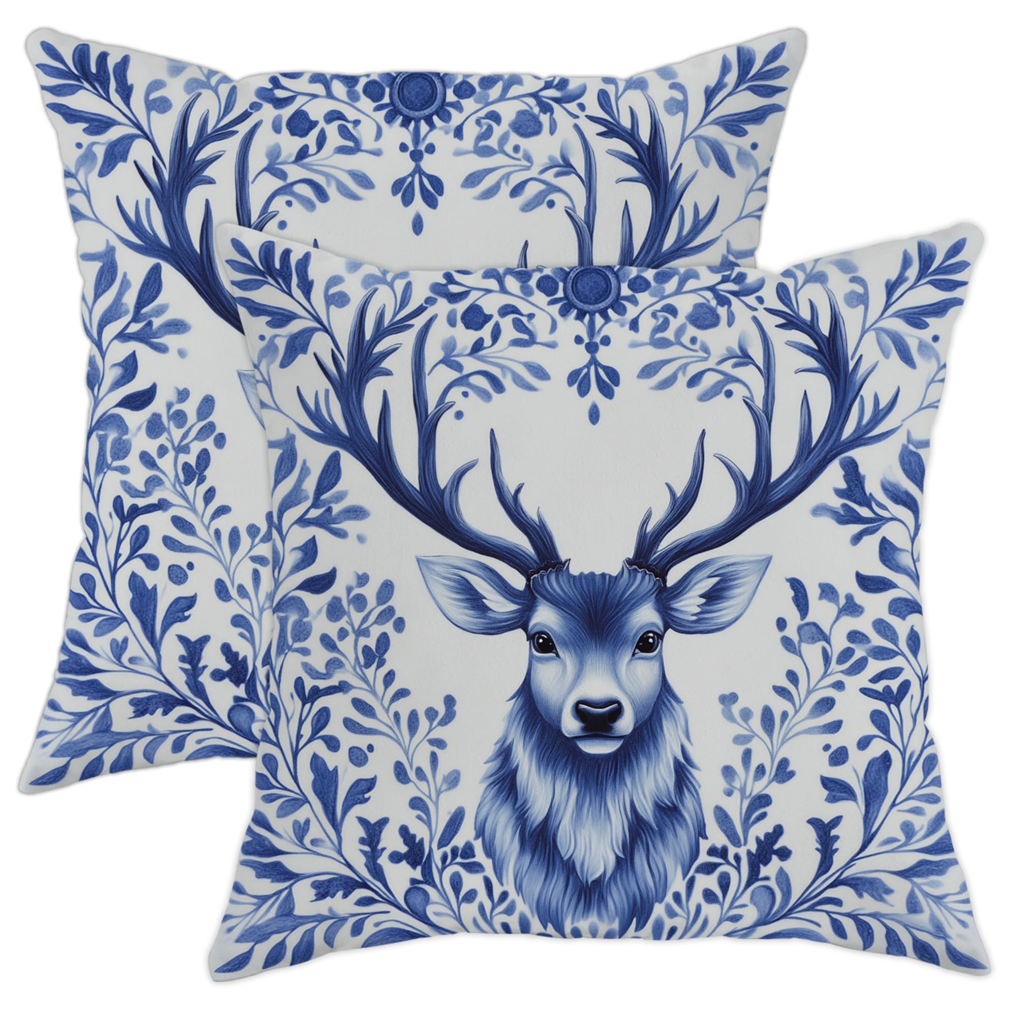 Velvet MATERIAL: Made of 100% Polyester velvetn, soft and skin-friendly, no fading or abrasion, can be used outdoors. pillow cover could add charming colors to your living room, bedroom, couch, sofa, car, balcony, patio or party, an elegant decorations to bring boo-tiful vibes to your home. INVISIBLE ZIPPER:The invisible zipper is sewn on the side of the pillow covers for a beautiful look. Firm and smooth.Including two pillow covers without inserts. Please allow 1~2cm deviation because of hand-cutting and sewing. MACHINE WASHABLE: Machine wash in cold water separately, gently cycle only, do not bleach. Stays the same and as new, after every wash. CONTAINS - Brand new couch pillow covers set of 2, No Insert. Floral Deer Pillow Covers Set of 2, Blue Antlered Stag Throw Pillows, Winter Farmhouse Decorative Square Cushion Covers for Home Sofa Bed Couch 18x18 Inch