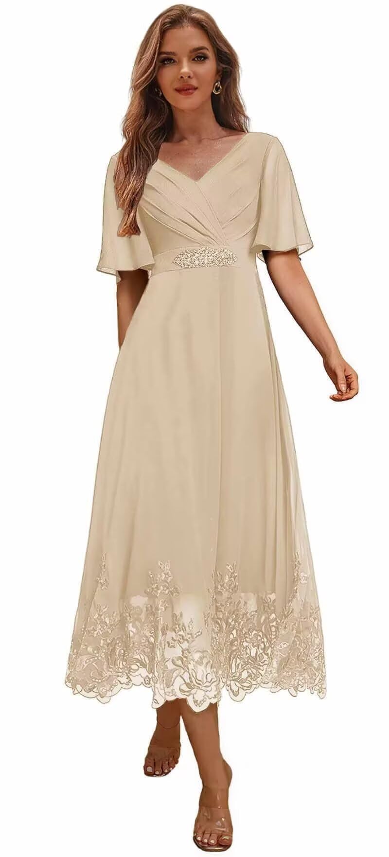 Material: The A-Line Tea Length Mother of the Bride Dress is made of lightweight high-qualified chiffon fabric, which is flowy, pleated, smooth and elegant for women and seniors to wear Feature: Designed as v-neck, empire waist, A-Line and was lace beaded, the modest and pleated evening dress can definitely make you stand out in the crowd and receive many compliments Occasion: The tea length chiffon cocktail dress is available in various occasions such as ceremonies, homecoming, parties, proms, family gatherings, holidays, anniversary, grad night, reception, special occasion, dinner, show, quinceanera, wedding party, debutante ball, cocktail party, birthday party, engagement, charity gala, etc Size: Please check our size chart before purchasing. If you prefer to customize, do not hesitate to refer to us and proffer with us your specific measurements data Service: If you have questions concerning the special pleated chiffon dress, you can email us, we would reply asap. If you’re not satisfied with the party dress you ordered, please feel free to leave us message