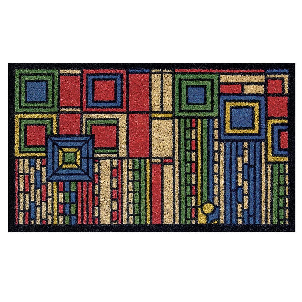 Frank Lloyd Wright Colored Saguaro Forms Design Doormat. Constructed in coir fiber pressed into a natural rubber base. Dimensions: 30 inches by 18 inches. The Saguaro Forms Doormat recreates one of Wright's most popular designs. Official Frank Lloyd Wright Collection item. The Frank Lloyd Wright Saguaro Forms Doormat recreates one of Wright's most popular designs. Saguaro Forms is one of a number of Liberty Magazine cover designs from 1926-27 that the editors thought to be too "radical" and never used. In 1973 there was a fire in the Arizona Biltmore. The graphic was selected from the Frank Lloyd Wright Archive to be rendered in stained glass in the reconstructed foyer. This doormat is constructed in coir fiber pressed into a rubber base. The proportions of this mat are 30 inches by 18 inches.