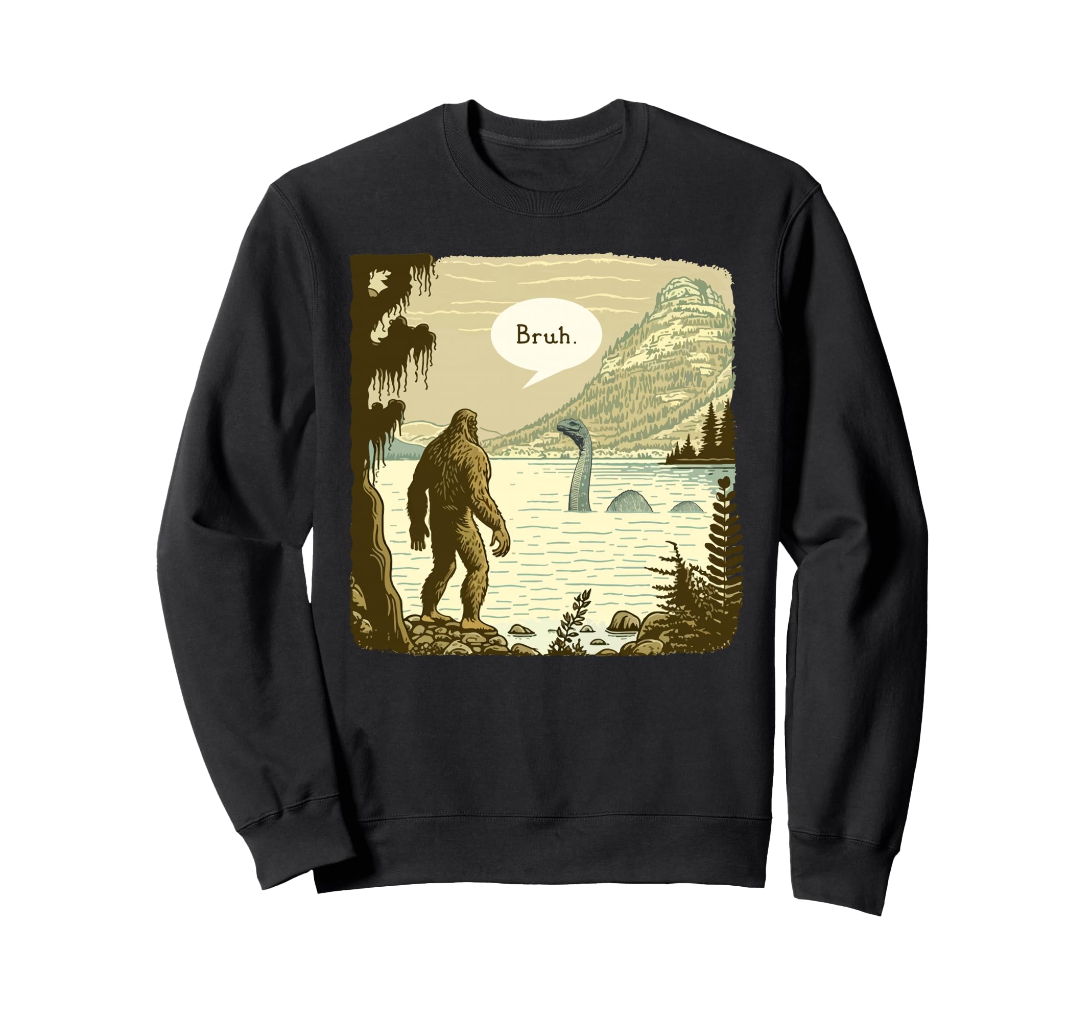 Here’s a funny and cute vintage-inspired design featuring the legendary Bigfoot, also known as Sasquatch! This retro design shows the beloved forest creature, Squatch, greeting his fellow introverted friend, the Loch Ness Monster with a simple, “Bruh.” Whether you believe in the paranormal or not, this is sure to spark conversations and smiles. Perfect for introvert lovers of all things cryptozoology and mythical creatures. 8.5 oz, Classic fit, Twill-taped neck