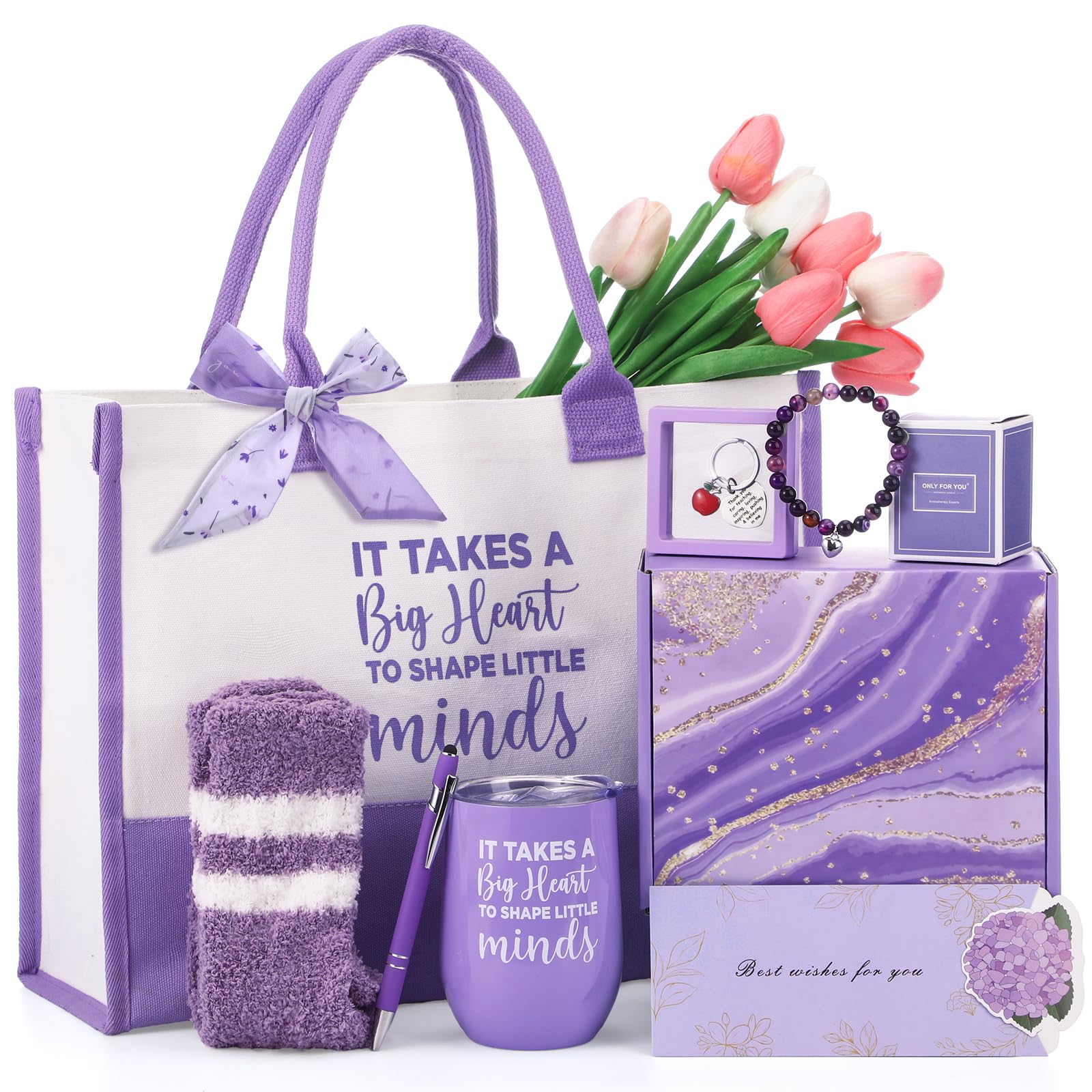 Teacher Appreciation Gifts Bulk Sets: you will receive 10 pieces teacher gifts, including 1 pair of purple coral velvet socks; 1 pcs 12 oz eggshell cup, 1 pcs greeting card, 1 pcs keychain, 1 pcs ballpoint pen, 1 pcs Tote bag, 1 pcs aromatherapy Candle, 1 pcs bow ribbon tied bag, 1 pcs purple natural stone bracelet, 1 pcs PE film box, these gifts set have unique text that reads' IT TAKES A BIG HEART TO SHAPE LITTLE MINDS', expressing gratitude for the teacher's hard work and dedication Purple Theme Design: our teacher appreciation gifts for women is designed with bright and warm purple color, which can fully express your gratitude and sincere wish to your teacher; Moreover, designed with sincere quotes, such as [IT TAKES A BIG HEART TO SHAPE LITTLE MINDS], the teacher thank you gifts can warm their heart Proper Size: teacher cups comes with 12 oz capacity, which is suitable for both indoor or outdoor events; Teacher appreciation socks are suitable for most people, fit size 6-12; The natural stone bracelet with elastic rope, bracelet proper size for adult women; A very practical gift box set, carefully picked for each product, allowing teachers to relax both physically and mentally after a long day of class Show Your Favorite and Respect: these gifts for teachers with appreciation words will be an exquisite way to show your favorite and respect to your teachers who are truly important in your life, which are suitable to be sent out for each occasions of Christmas, Teachers' Day, Thanksgiving Day, teacher appreciation week, open school season, end of the term or graduation season, birthday, wedding Fine Workmanship: our teacher gift basket is elegant designed, avoiding the embarrassment of using gift boxes filled with simple and inexpensive goods and there is no need for repackaging; This is the good last minute gift; Suitable for all occasions such as Teacher's Day, Teacher Gratitude Week, and Back to School, it is a nice teacher gratitude gift, the teacher gratitude gift box comes with a purple greeting card, in which you write your gratitude to your favorite teacher Keep away from children, pets, and flammable materials during use candle. Avoid leaving burning candles unattended. Use in an upright position and in a wind-free environment. Features: Suitable gift for teacher: Every item in our pampering gift sets for women has been chosen with thought and care to create the most special moment for teacher in your life. It makes suitable gifts, relaxing gifts, wedding gifts for teacher gifts, graduation gifts, retirement gifts for women, mom, grandma, wife, best friend. Girlfriend bridesmaid teacher nurse daughter aunt coworker. It's also nice self care gifts for women. Applicable Occasions: This a suitable gifts for best teacher for Christmas, Thanksgiving Day, Teachers' Day and other anniversary such as teacher retirement, teachers' birthday. You can see the sparkle in her eyes, smile at her face even tears of joy when she opens this gift box. It must be very nice to show her your favorite and thanks for believing, supporting, encouraging, make her feel extra special. Specifications: Material: Teacher cup: stainless steel Socks: coral velvet Color: purple Size: socks size fit size 6-12 Package includes: 1 X Wine tumbler 1 X Natural stone bracelet 1 X Soy wax aromatherapy candle 1 X Greeting card 1 X Ballpoint pen 1 X Tote bag 1 X PE film box 1 X Gift box 1 X Bow ribbon 1 X Keychain 1 Pair of socks Notes: The color may exist a slight difference due to different screen displays.