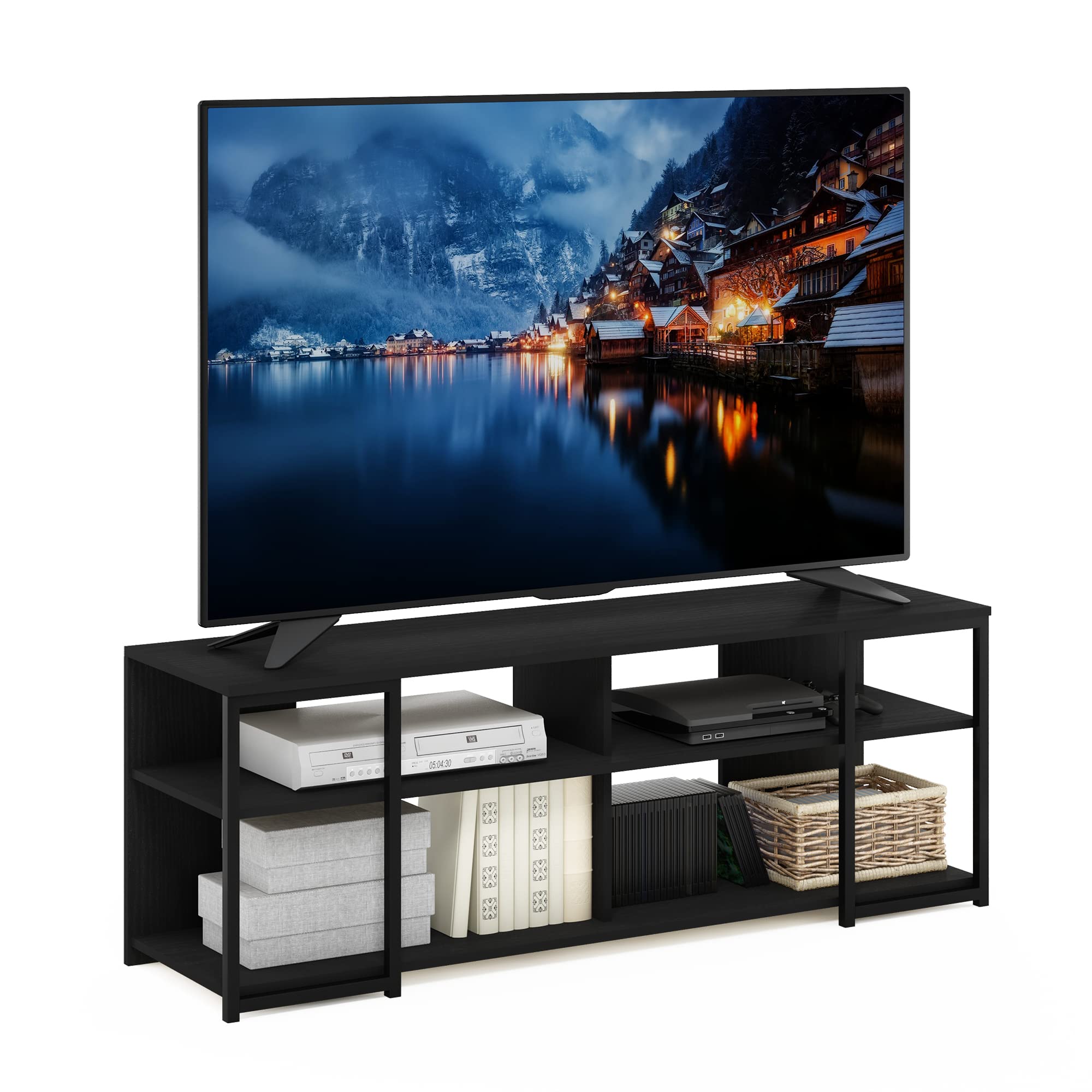 Clean-lined and stylish design blends easily with any other furniture style. Fits TVs up to 65 Inch, supports up to 60 lbs. Manufactured from durable CARB Grade composite wood and metal frame tested tested for sturdiness and durability. Fixed open shelves hold perfectly your DVD components and gaming consoles. Holds up to 25 lbs per shelf. Product dimension: 56.3 (W) x 20.1 (H) x 15.6 (D) inches.