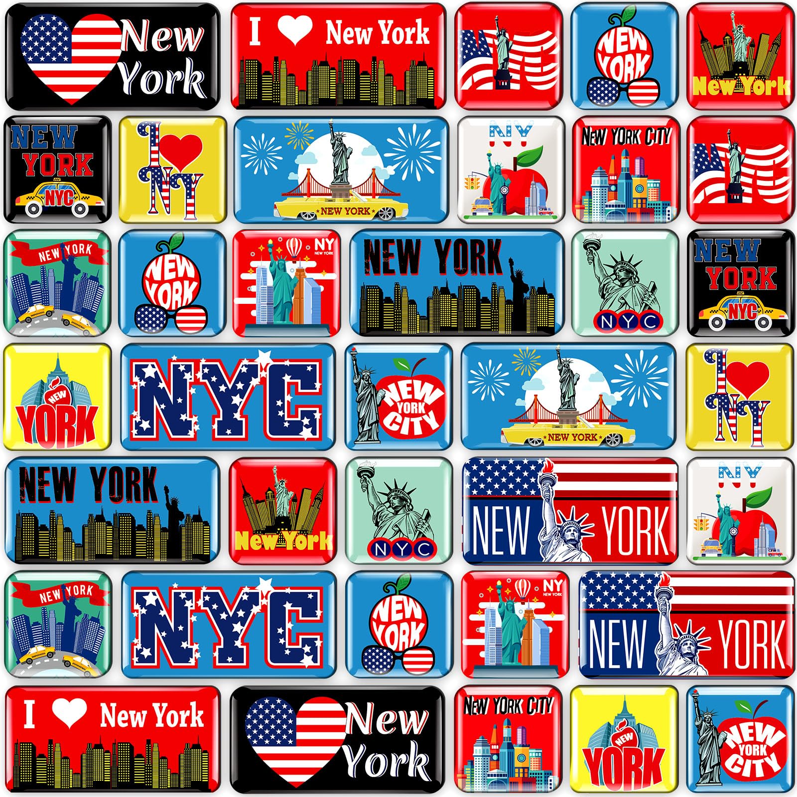Sufficient Quantity and Unique Style: our pack of 36 New York magnets for refrigerator contains 18 unique designs, with 2 pieces for each style; Give your refrigerator a unique makeover by incorporating your passion for the city that never sleeps; It's the ideal way to keep the spirit of New York close to home Convenient and Easy to Use: each New York magnet, measuring about 1.4 x 1.4 inches and about 2.75 x 1.36 inches, the specific size as shown in the picture, offers a convenient size ideal for most refrigerators, providing a hassle free solution for decoration or utility Reliable and Long Lasting: our cute magnets are crafted with epoxy top and magnet at the bottom for longevity and a dependable magnet for secure attachment, these appreciation magnets are as reliable as they come; They are ideal housewarming gift, desk accessory or gift for coworker Exquisite Design: experience the essence of New York in the comfort of your own home; Our New York city magnet has different styles reflecting the city's most loved iconic images, such as Statue of Liberty, American flags, and more; It offers a unique combination of form and function, keeping your notes on the fridge while also bringing beauty to the kitchen Gift: with their versatile applications, these New York magnets serve not only as home decorations but also as fashionable gifts or souvenirs for your family and friends who love the city of New York or New York culture; Whether it's a simple note, a new recipe, or a memorable photograph, let these beautiful magnets hold them in place for you Features: New York city: Collect and display mementos from your favorite city with our New York fridge magnet. Each magnet features a unique design that captures the essence of New York, turning your fridge into a mini gallery of memories and experiences. Warm memory: Let these New York theme gifts be a stylish canvas for your memories. Whether it's holding a precious photograph or a reminder for grocery shopping, they serve as constant bearers of delightful memories and important messages. Transform your fridge into a New York themed message board. Specifications: Material: magnet Color: as pictures shown Size: as pictures shown Package includes: 36 x New York Fridge Magnets Notes: Manual measurement, please allow slight errors on size. The color may exist a slight difference due to different screen displays. Fragile items are included, please be careful when using, and please keep them away from kids.