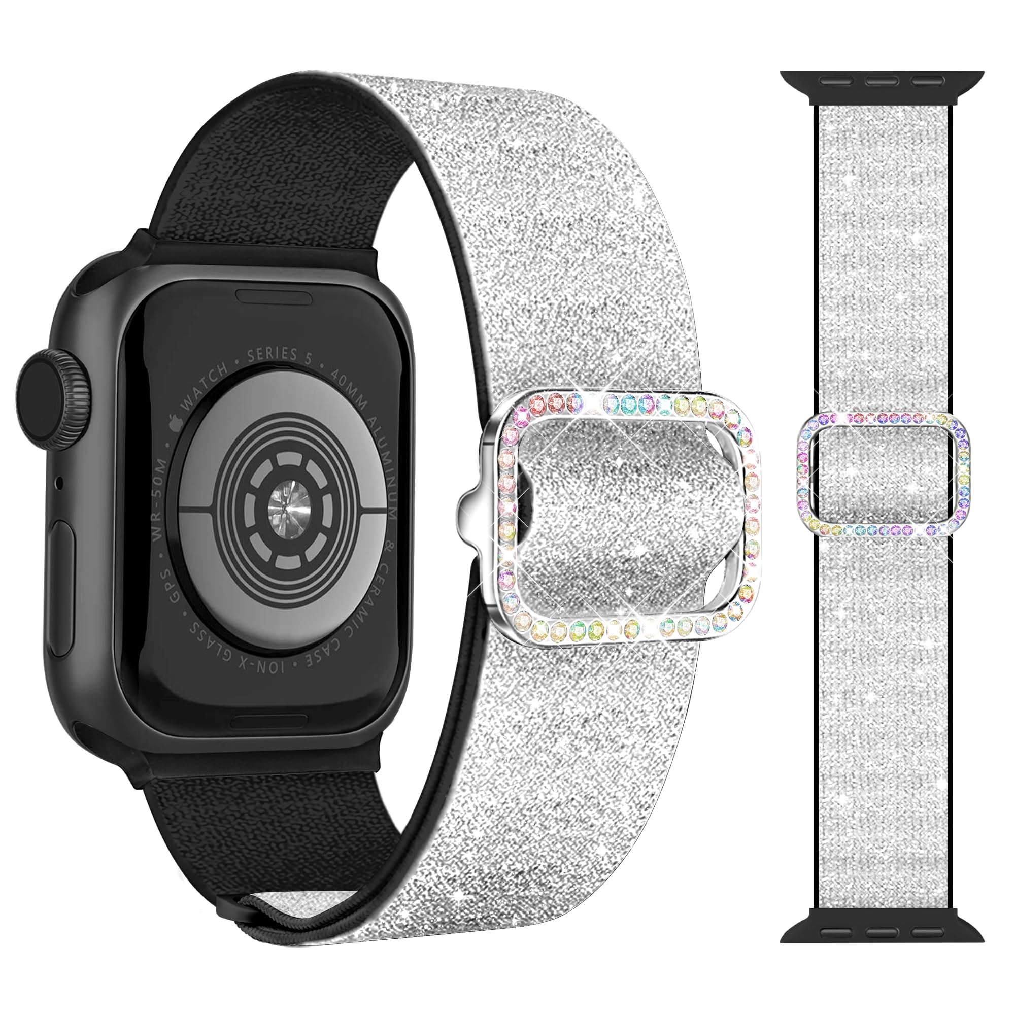★Compatible with All Apple Series Models★: G-ficu iwatch bands for women are compatible with iWatch Series 11 Series 10 [42mm] / iWatch Series 9 8 7 6 5 4 3 2 1 [41mm 40mm 38mm] / iWatch SE 3 2 1 [40mm]. The size can be adjusted freely: Apple Watch bands 40mm 41mm 42mm(S10/11) 38mm are for 5.12"-7.87" wrist. ★Shining Like Starry Sky★ The apple watch band's outer surface is reflect a dreamy dazzling luster under the light. When you wear it and rotate or swing your wrist, the iwatch band will exhibit a marvelous sparkling effect. Really amazing! Unique sparkling design makes you look more dynamic and individual. ★Breathable & Comfortable★: Made from washable and breathable nylon material, these stretchy apple watch bands for women /men are lightweight, stretchable, and durable. They provide a snug fit and keep your wrist cool and comfortable, even during extended wear. ★Super Easy to Adjust & Wear★: This dressy apple watch band features a premium slider that allows for adjustable length, providing a perfect and snug fit on your wrist. The durable super stretchy elastic makes it easy to slide on and off your wrist. ★Buy with Confidence★: If you meet any dissatisfaction, we provide two years of after-sales service. Any question or problem, please feel free to reach out us. (Package includes: 1 x iwatch band, 1 x instruction manual. The watch is not included.)