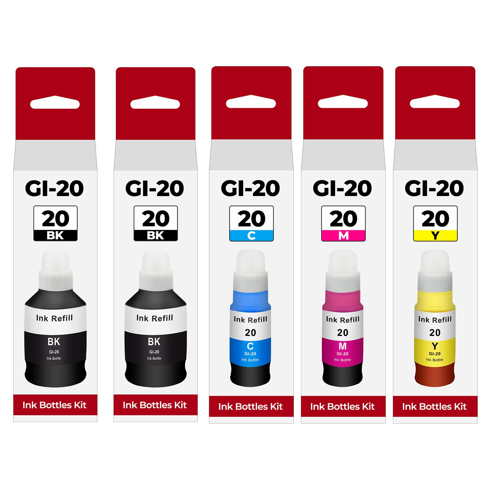 Compatible Printer, GI-20 GI20 GI 20 Ink refill bottles compatible with Canon PIXMA G6020 MegaTank Printer, compatible with Canon PIXMA G7020 MegaTank printer, compatible with Canon PIXMA G5020 MegaTank printer, which are replacement for canon G7020 ink refill bottles, replacement for canon G6020 ink refill bottles, replacement for canon G5020 ink refill bottles, replacement for canon G6020 ink G7020 ink G5020 ink GI20 Ink Product Name, compatible for canon 20 ink refill bottles kit, compatible for canon GI-20 GI20 GI 20 ink, compatible for canon GI-20 GI20 GI 20 ink bottles set, compatible for canon 20 ink refill High Yield GI-20 Ink Refill, 8,300 pages per compatible for canon 20 GI-20 ink bottle black, 7,700 pages per compatible GI 20 color cyan magenta yellow ink bottle. (at 5% coverage on A4 paper) GI-20 Ink Combo Pack Packing List, 5 bottles ink refill for canon GI-20 GI20 GI 20 ink include 5 pack 170mL Compatible for Canon GI-20 black noir negro ink refill bottle, 1 pack 70ml Compatible for Canon GI-20 cyan ink refill bottle, 1 pack 70mL Compatible for Canon GI-20 magenta ink refill bottle, 1 pack 70mL Compatible for Canon GI-20 yellow jaune ink refill bottle Tips: The OEM black ink is pigment-based, while our GI-20 ink is dye-based. If your printer still has OEM ink in it, do not refill our black ink, as mixing pigment and dye inks can impact your printer’s performance and print quality. Make sure to clean the printhead before using our ink to protect your printer and ensure the best printing results Compatible Printer, GI-20 GI20 GI 20 Ink refill bottles compatible with PIXMA G6020 MegaTank Printer, compatible with PIXMA G7020 MegaTank printer, compatible with PIXMA G5020 MegaTank printer, which are replacement for G7020 ink refill bottles, replacement for G6020 ink refill bottles, replacement for G5020 ink refill bottles, replacement for G6020 ink G7020 ink G5020 ink GI20 Ink Product Name, compatible for 20 ink refill bottles kit, compatible for GI-20 GI20 GI 20 ink, compatible for GI-20 GI20 GI 20 ink bottles set, compatible for GI20 ink refill High Yield GI-20 Ink Refill, 8,300 pages per compatible for GI20 GI-20 ink bottle black, 7,700 pages per compatible GI 20 color cyan magenta yellow ink bottle. (at 5% coverage on A4 paper) GI-20 Ink Combo Pack Packing List, 5 bottles ink refill for GI-20 GI20 GI 20 ink include 2 pack 170mL Compatible for GI-20 black noir negro ink refill bottle, 1 pack 70ml Compatible for GI-20 cyan ink refill bottle, 1 pack 70mL Compatible for GI-20 magenta ink refill bottle, 1 pack 70mL Compatible for GI-20 yellow jaune ink refill bottle