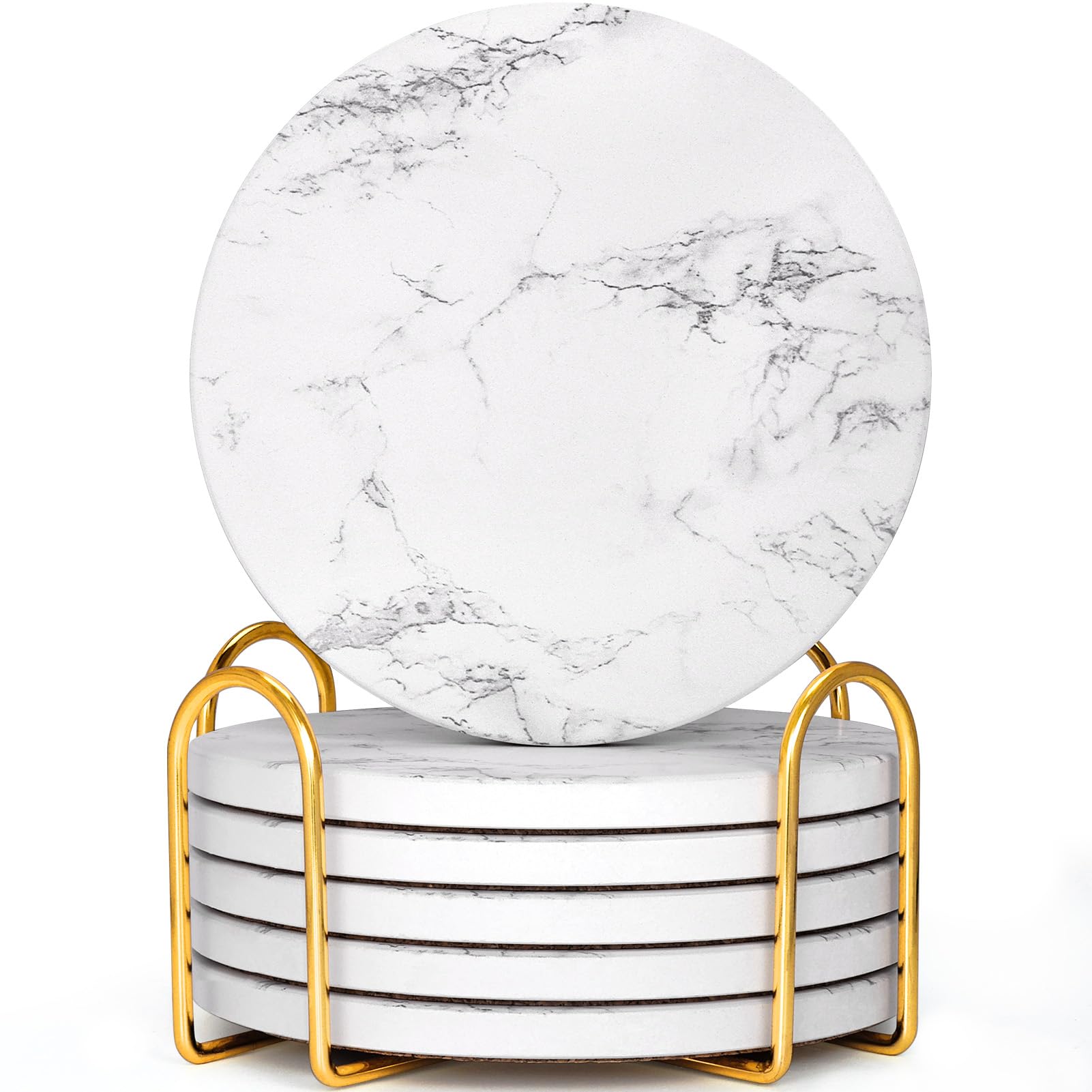 SUPER ABSORPTION: Ceramic coasters are made of special absorbent materials that are more absorbent than stone, silicone, or plastic coasters. They can quickly absorb liquids in just a few seconds, preventing overflow onto the desktop and keeping it clean. PROTECT DESKTOP: The bottom of the coaster is made of a non-slip sawdust foot mat that will not scratch the table top. Ceramic has excellent thermal conductivity, allowing it to absorb and disperse heat, thereby protecting furniture from potential heat damage. IDEAL FOR GIFTING: These ceramic coasters are a perfect gift for friends on occasions such as housewarming birthdays, weddings, graduations, parties, Christmas, Thanksgiving, and other special events. It is suitable for various settings, including homes, living rooms, kitchens, coffee shops, bars, and restaurants. This beautiful and practical gift is sure to be loved by your friends. GOLD METAL HOLDER INCLUDED: With a gold metal holder, it can be used to decorate the desktop, adding both beauty and practicality. Ceramic coasters can be stacked on the metal holder, saving storage space and protecting them from bumping into each other, preventing wear and tear while keeping them clean. HOME DECORATION: These marble coasters are the perfect choice for home decor, adding an artistic atmosphere to your home, easily blending with any style—whether modern minimalist, classic vintage, or cozy rustic—adding a touch of sophistication and elegance to your space. It’s not just a practical coaster, but also a beautiful home decor piece that brings personality and charm to every corner. Product Features: Practical Protection Prevents water/tea stains from damaging wood/glass/marble surfaces Heat-resistant for hot coffee, teacups, and other beverages Decorative Appeal Elegant prints elevate home/office aesthetics Multiple pattern options (Nordic/ins/retro styles) to match various decor themes Easy Maintenance Waterproof ceramic surface wipes clean instantly Stain-resistant, won’t yellow over time Versatile Use Doubles as mini placemats, jewelry trays, or candle holders Target Customers: Home Decor Enthusiasts Urban women valuing lifestyle quality Young renters upgrading living spaces Office Professionals White-collar workspace accessories Conference room hospitality use Commercial Venues Café/restaurant table settings Hotel room amenities Gift Shoppers Housewarming/wedding presents Birthday/holiday gifts Organization Lovers Minimalists pursuing tidy desktops Usage Scenarios: Home Settings Coffee tables with tea sets Breakfast coffee moments Balcony afternoon tea photos Work Environments Coffee cups by computers Client meetings in conference rooms Business Spaces Café branding displays Upscale dining ambiance Special Occasions Wedding banquet decor Holiday party arrangements Social Media Food blogger photography props Instagrammable home styling