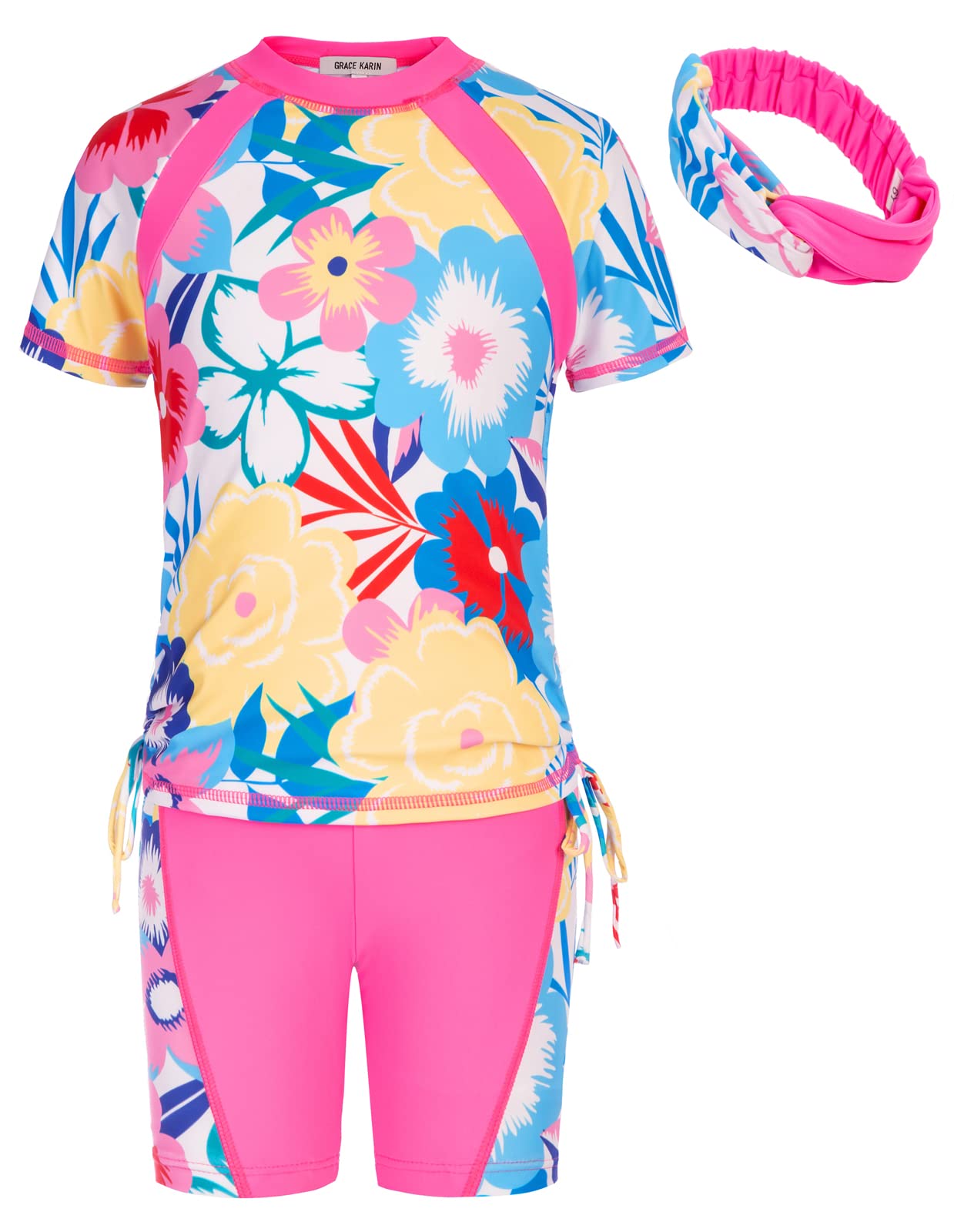 【Ergonomic Design】GRACE KARIN girls rash guard swimwear consists of a short sleeve shirt, elastic waist swimming shorts, and a matched headband. It's suitable for girls aged 6-12. Two-piece design offers full coverage and comfort along with greater flexibility while your little girl grows. The shorts are partially lined in the front to provide good security protection. 【Material】The rash guard girls is made of 85% polyester and 15% elastane. Soft, lightweight, breathable and skin-friendly fabrics provide ultimate comfort and total protection throughout the day. 【Adorable Patterns】3D printing is durable and will not fade, including mermaids, flowers and geometry. Colorful patterns accompany your girls all summer long, perfect for summer swimwear, beach party, pool party, water park, solarium and vacation. 【About Size】Girl rash guard may fit fine for skinny kids, but you can order a size up if you are worried about it being too tight or small. Please check our size chart carefully before ordering! 【Garment Care】Hand wash with cold water below 30℃ is recommended. Do not bleach or dry-clean. Dry Flat. GRACE KARIN Kids Separated Swimsuit Short Sleeve Crew Neck Swim Tops+Shorts+Hair-Band