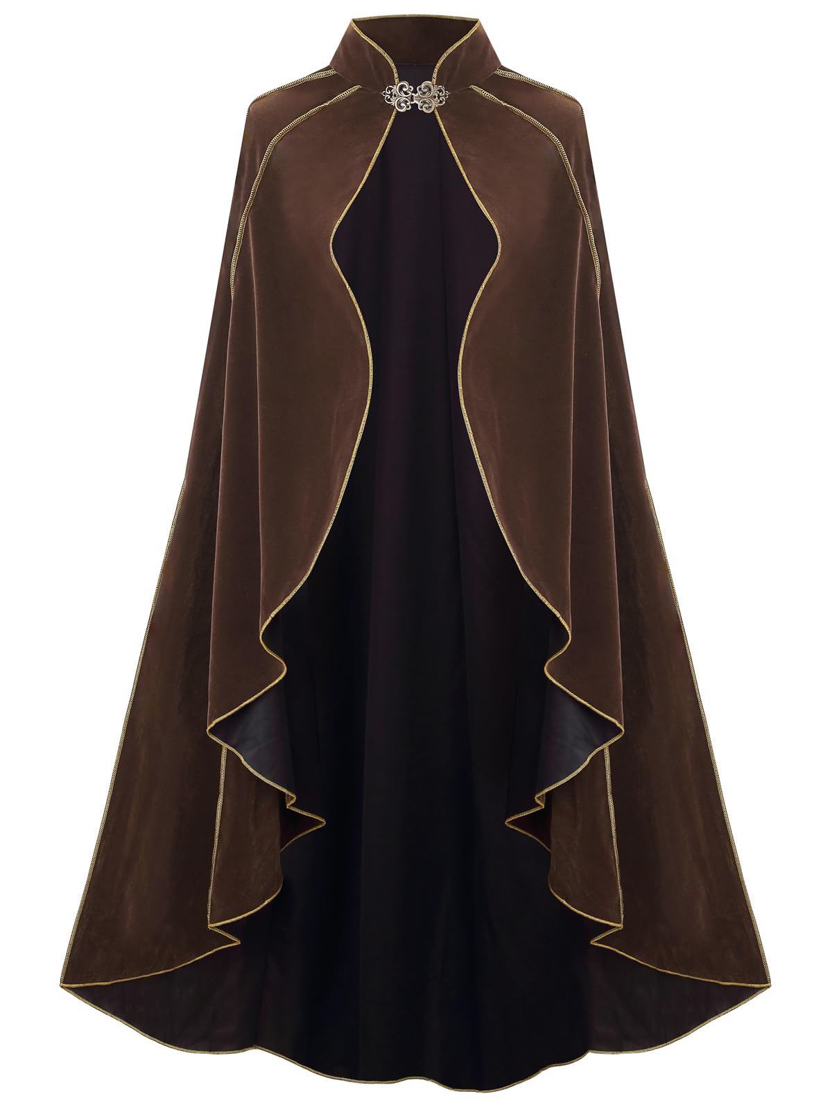 Material: The vintage cape made from high quality crushed Velvet fabric, can give you a warm, airy feel. Neck clasp in bronze metal Size: Two size options for the total length 43.3 inches and 51 inches (about to reach the calf). Color: Available in Green, Brown, Black, Red, Purple, Royal blue and Blue Grey color. Rich color choice,make your dress more elegant Feature: This Adult Medieval Cloak has a stand-up collar and metal clasp at the neck, with gold trims around the edge and all over the cape Cosplay: Can be worn as Medieval Costume, Renaissance Victorian Cloak, Vampires or Witch Cape, Halloween costume, Queen Robe, Royalty Outfit Occasion: Halloween, Christmas, Renaissance fair, Medieval Festival, Mardi Gras, Animation Festival, Stage Performance, cosplay costume party, Masquerade Ball, art photography Packge Include: One-piece Velvet Cape.
