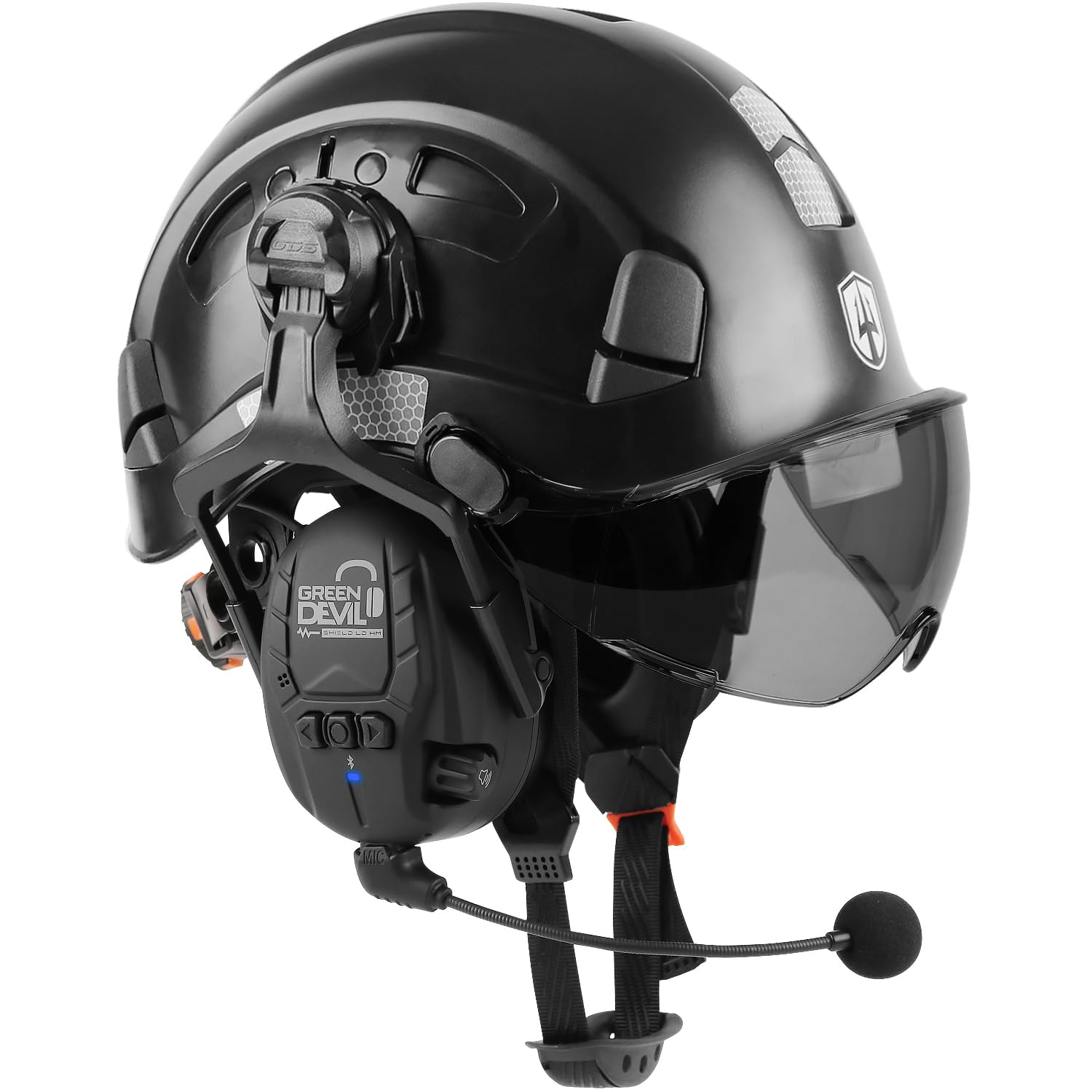 Introducing the ultimate safety helmet for all your industrial and construction needs——GREEN DEVIL hard hat with dual Layers visor,upgraded bluetooth hearing protection , additional cooling helmet liner and waterproof drawstring bag 6 in 1 Advanced Helmet Kit 【Upgraded Bluetooth Earmuffs with Mic】With latest 5.3 Bluetooth Headphone,enjoy excellent, quality music with the high-quality microchips and Hi-Fi speakers.No Longer Boring At Work and Achieve Take or Answer Calls Hands-free!27dB High noise reduction rating protect your hearing from hazardous sound levels during working.Use Integrated surround microphones capture and transmit ambient noise via the SAL function to provide users with advanced situational awareness within the capsule. 【Dual Layers Eye Face Protection】:It merges an adjustable high-definition eye protection with a half-face tinted visor for unrivaled protection and convenience.High-quality tinted visor can provide face debris impact protection ,prevent scracth and dust,also can be ANTI-UV. Built-in visor enhance good visibility and eye debris protection.Both can easily slide up or down, allowing for convenient customization based on the worker's needs. 【JOB-SITE READY】:This work hardhat for men women meets the ANSI Z89.1 Type 1 Class C requirements ,the visors meet ANSI Z87.1-2015 standards,the bluetooth earmuffs meet ANSI S3.19 standards,so you can be job-site ready.Suitable for construction,woodworking,mechanics,forestry,manufacturing,height and scaffolding work ,in any trade that requiring general head protection. 【Comfortable Fit】:Adjustable 6-point suspension system for improved shock absorption and overall comfort.The replaceable sweatband with porous coating for maximum sweat absorption make workers comfort fit during whole working hours.Comfortable and convenient chinstrap with molded chin-cup for extra security and stability,also it's easy to remove.One adjustable size fits most. Helmet size range from 53-63cm/ 20.86-24.80 inch. 【Thoughtful Quality Service】:GREEN DEVIL hard hat with dual Layers visor,upgraded bluetooth ear protection and headlamp combination is a good partner in your work. It is also a unique gift for family and friends.If you have any questions or suggestions about our safety helmet, please feel free to contact us. We are here 24/7 to chat and and give you the most satisfactory results and help. ..