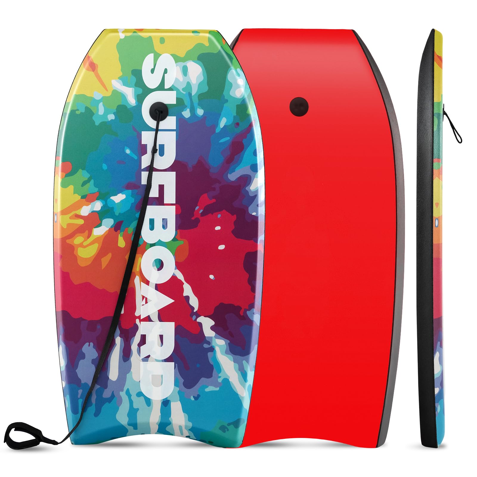 Our bodyboard is perfect for playing on the water for hours. Made of waterproof XPE deck and smooth HDPE, this bodyboard can absorb shock as well as greatly reducing the friction when you use it. And the EPS core improves durability and tensile strength. The crescent tail has a good fluidity that is ideal for superior control and suits your different riding styles. The lightweight design makes it easy to carry to the beach, ocean, river or swimming pool. The wrist rope attached to the bodyboard can be adjusted to fit different people’s wrists or ankles to prevent it from being washed away by big waves. Minimum user age: 3 years old