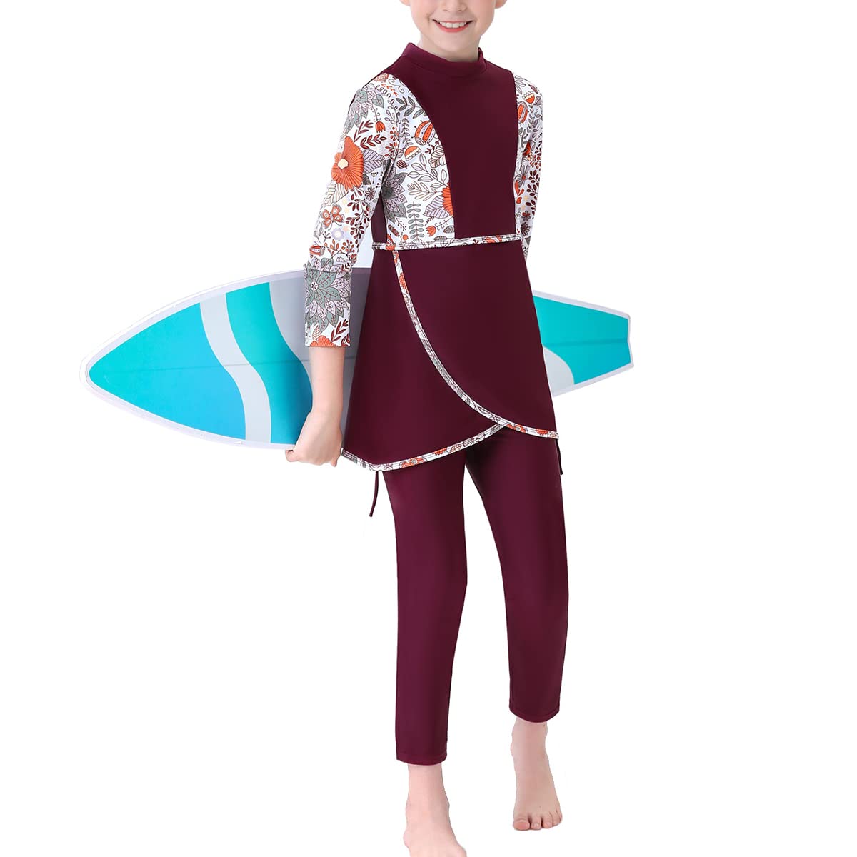 Two Piece Muslim Swimsuit for Girls: Muslim swimsuits for girls kids 2 pieces burkini swimsuits for girl. Modest Islamic Hijab Burkini Rashguard swimsuit long sleeve swimsuits for kid, capri swim wear swimming pants leggings and hijabs for girls muslim. Full coverage swimsuit for little girls, quick drying modest swimsuit bathing suit, Islamic modest burkini swimwear, child Two pieces swimsuit full coverage toddler rash guard girl conservative swimming for holiday beachwear; Full Coverage Swimwear Top: Girl modest Muslim swimsuit full coverage swimwear Islamic hijab swimming burkini swim suit, vintage full cover swimming crew neck long sleeve rash guard for Muslim kids. Long sleeve swim tops dress, adorable Burkini Hijab Islamic swimwear for toddler kids. Pullover mock neck swimsuit for Muslim girl. Little big girl Hijab UV Muslim swimsuits for girls, beach surfing outfit, muslim dress for kids hijab cover up for swimming; UV-proof Long Swimming Pants: Muslim girls swimwear, vintage and full cover design for Muslim girls. Long sleeve top, without chest pads or underwire, pullover style for easily putting on or taking off. Printed with flowers or leaves, pretty and stylish. Elastic waistband full length pants, with a tie from the tops to the pants to keep the top from riding up while swimming. Full coverage surfing rash guard UPF 50 and to escape the sun light, protect kids delicate skin from sun harmful Select Size: Little girls Modest Islamic Hijab swimsuit two pieces Arab Islamic burkini swimwear for kids girls age 18-24m, 2-10 years old. Elegant full covered burkini swimwear with swimming cap, modest Islamic Hijab, top pants. Girls swimming suit sunsuit wetsuit Islamic swimming hijab swimwear modest swimwear full length active burkini muslim swimsuit for beach getaway, Hawaii holiday, pool swimming,water skiing, diving, learn to swim, children school swim lessons, diving suit Rashguard; MULTI-PURPOSE: : Burkini swimsuits for girls, Arab Islamic swimming suit for girls kids. Muslim swimwear for kid girls children modest swimsuits burkini outfit long sleeve short sleeve swim top pants, 2pcs set. This full cover swimsuit is for summer beach, bathing, swimming, pool party, holiday, swimming learning, surfing, Hawaii vacation, learn to swim, children school swim lessons, birthday, photo shooting, beach fun, diving, snorkeling or other water activities ◕‿◕-----PRODUCT DETAIL----