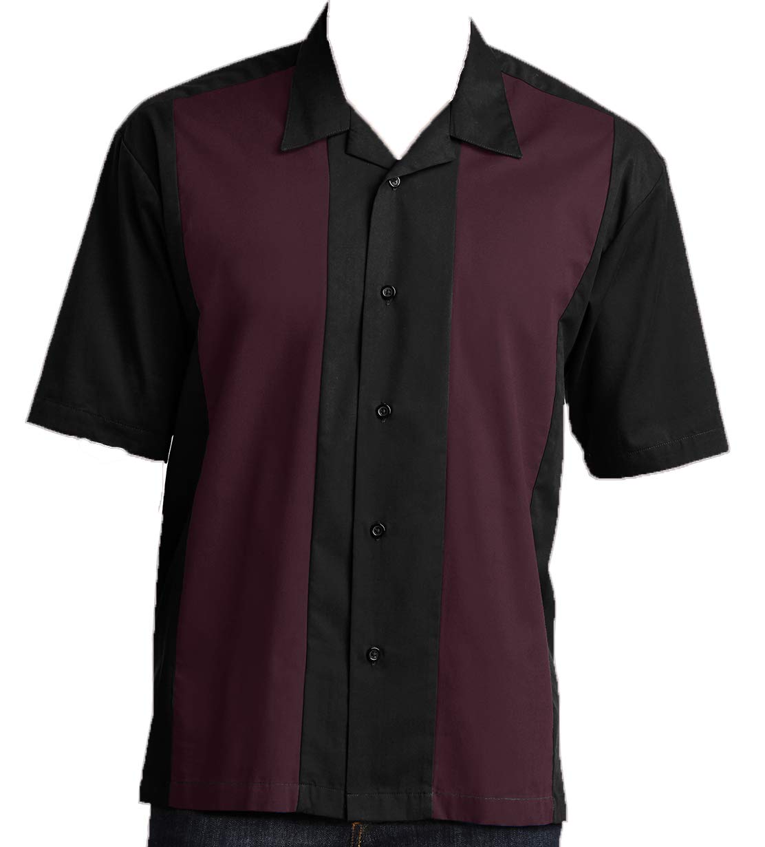 Wrinkle Resistant 4.5-ounce, 55/45 soft cotton poly blend Camp style collar with dyed to match buttons Good Life Palm Frond Logo printed on inside neck as shown in photos Solid Black Shirt with colored retro panels down front of shirt - Back of shirt is solid black Machine Wash or Dry Clean Great looking retro style camp shirts that feel as good as they look!