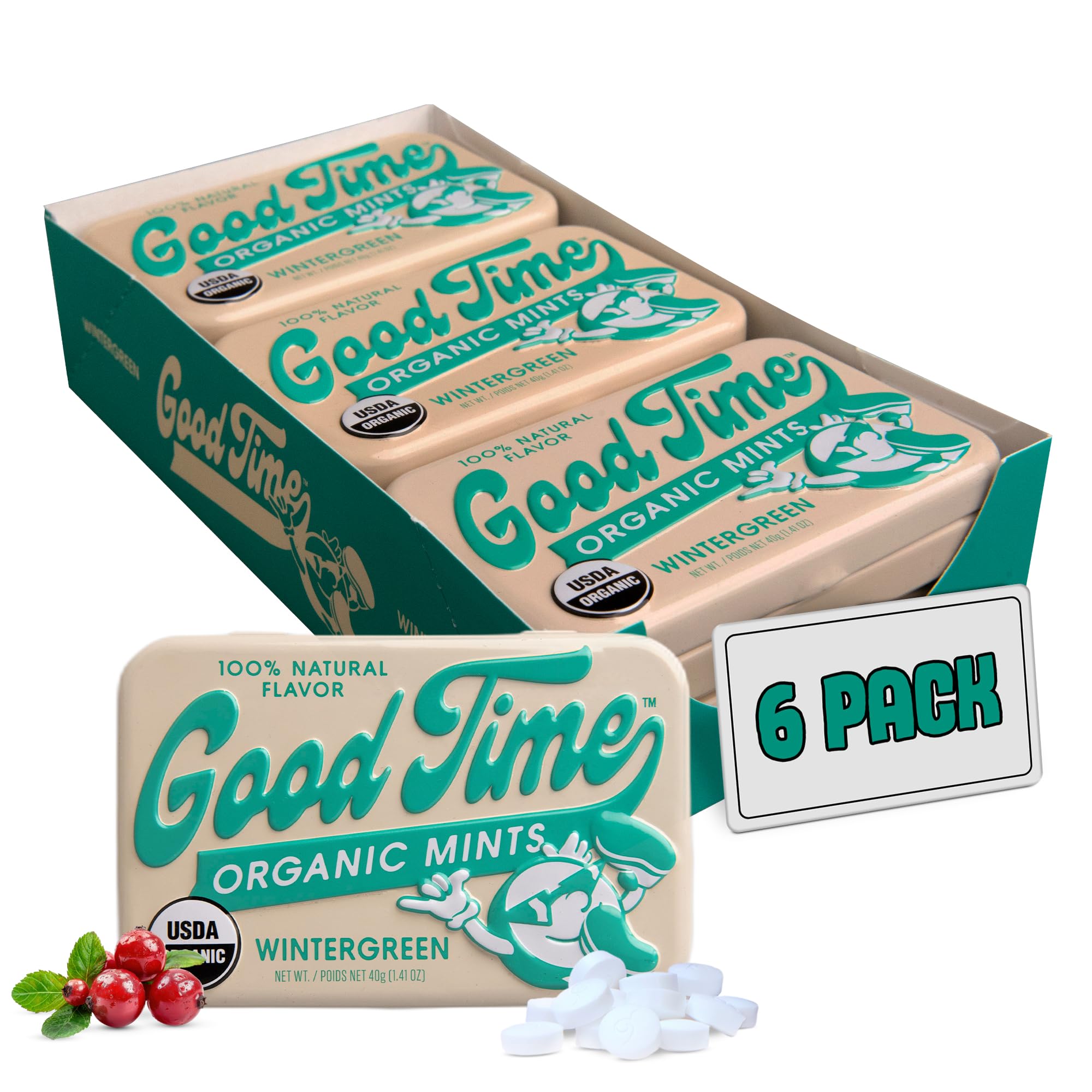 Never turn down a mint... Instant fresh breath to boost your confidence - these mints are smooth and flavored to take care of bad breath. Good Time Organic Mints is an exciting new brand of delicious organic mints. Our mints are Kosher, Vegan, and Gluten Free. They contain no artificial sweeteners, flavors or colors. Try them in three classic flavors - Peppermint, Wintergreen, and Cinnamon.