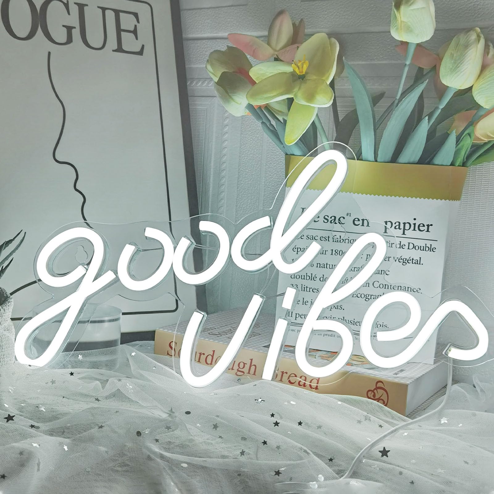 Good Vibes Neon Sign, LED Neon Signs for Wall Decor, White Neon Lights for Bedroom & Party Art Decor, USB Powered Bright Neon Light for Lover, Friends