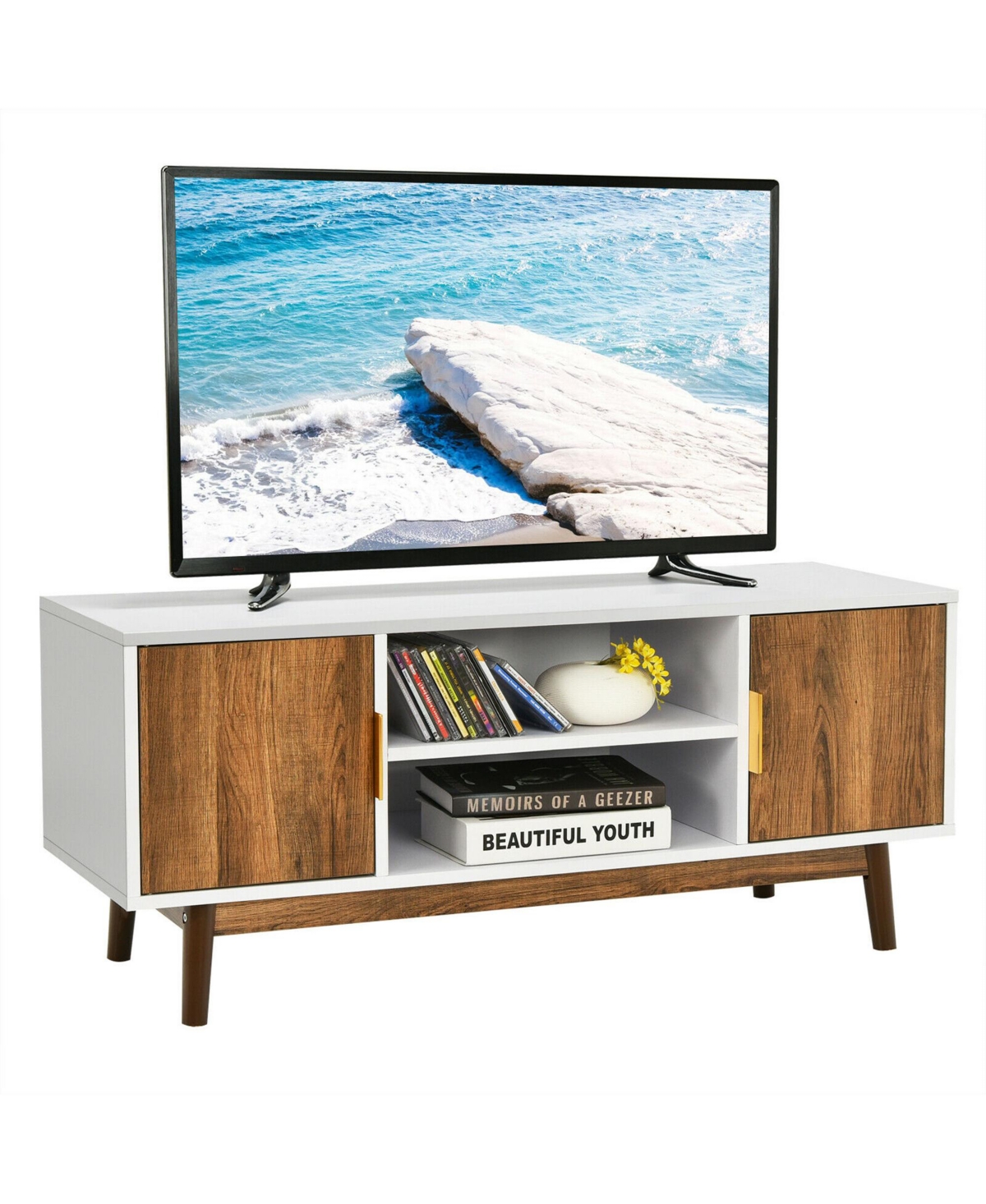 The perfect combination of white board with rustic oak wood grain delivers a charming feeling to seamlessly match your home surroundings. Not only can this media console be used as a Tv stand to support flat screen Tv up to 50 inches, but also be suitable for living room to store home necessities. Enclosed cabinets and open shelves achieve the perfect balance between private storage and convenient display. All of your media players, DVDs, audio equipment and routers can find their perfect storage space. There are 2 pre-drilled cable holes to help organize the wires and cords of different devices. Say goodbye to the visible messy surroundings and enjoy a fun leisure time with your family.Features:Holds flat screen TVs up to 50 inches and provides a good viewEnclosed cabinets and open shelves for ample storage spacePremium material, better hardness and higher durability