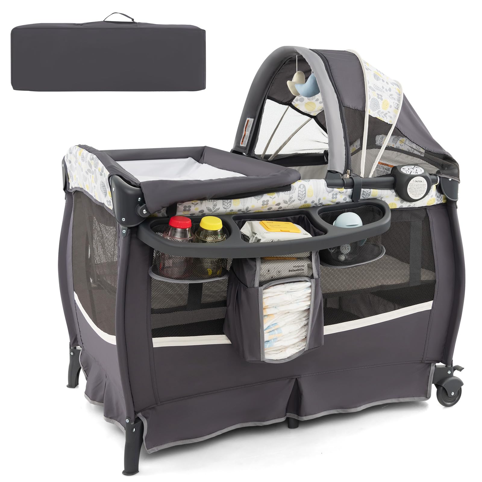 This pack and play is can server as an infant bassinet(with 20 lbs weight capacity), baby crib, diaper changing table(with 20 lbs weight capacity) and baby playpen(with 33 lbs weight capacity). Featuring a bassinet, mattress and changing table, this versatile baby playpen ensures your baby's comfort and makes parenting a breeze. The setup is easy without tools: keep the bed standing vertically; open the short armrests of bed; open the long armrests of bed; press down the bottom. And a carry bag is included for traveling or storage. The music box and cute hanging toys provide your baby with a fun and comfortable space. The 7-point support metal frame ensures great sturdiness, and the harmless fabric is safe for kids to bite.