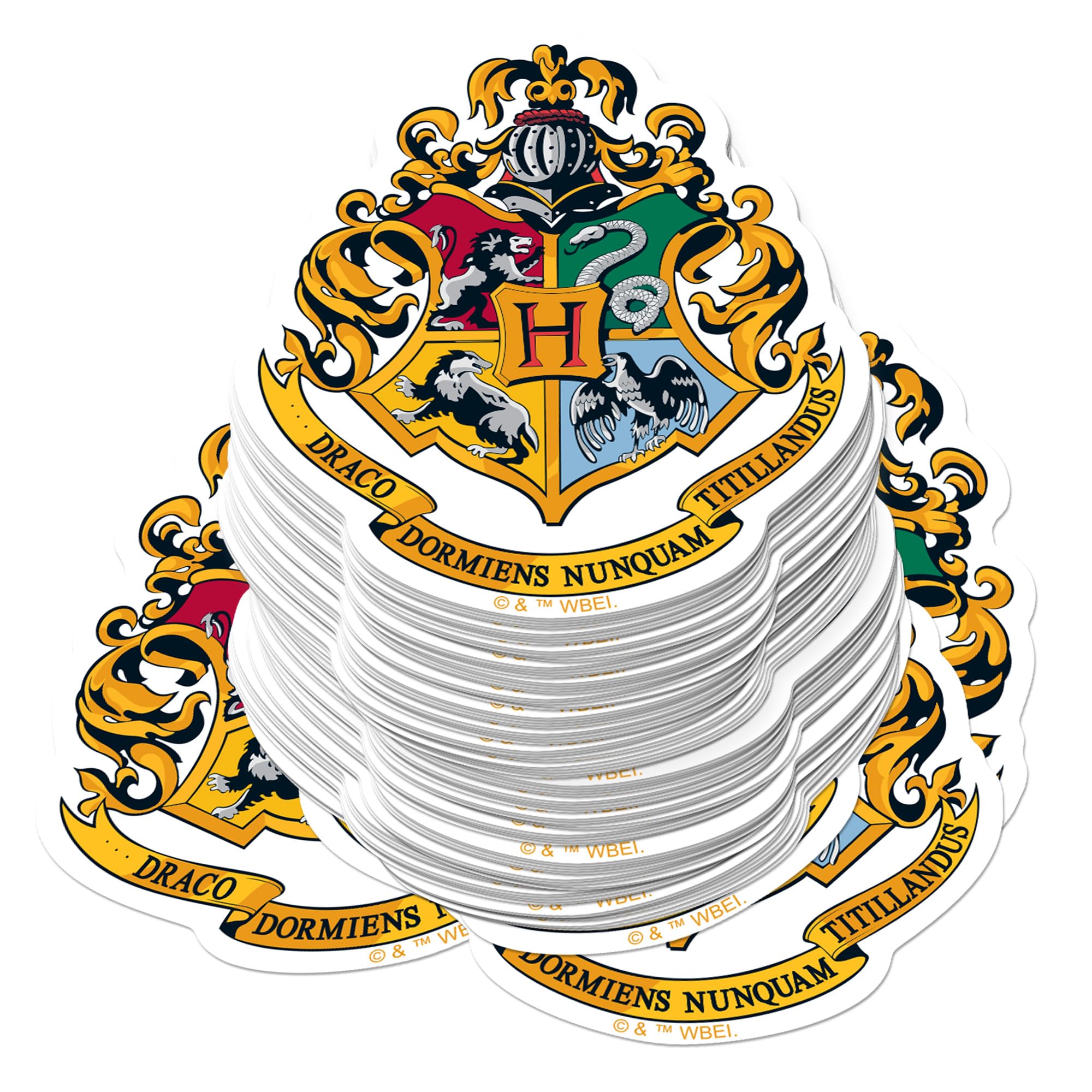MAKE YOUR MARK: Fuel your fandom with this exclusive collection of iconic die cut stickers. Designed to take a beating, our licensed go-anywhere decals are ideal for laptops, tablets, water bottles, scrapbooks, mirrors, notebooks, journals, lockers, skateboards, cars, bicycles, and more. JUST PEEL & STICK: Includes 2 of each of the 50 unique designs for a total of 100 themed stickers in an array of shapes ranging in size from 2.5" to 4". Printed on high-quality premium adhesive vinyl for long-lasting saturated images resistant to peeling and fading. FUN FOR KIDS, TEENS AND ADULTS: Suitable for smooth surfaces, these stickers are great for scrapbooking, crafting, calendars, planners, invitations & more. Perfect as party favors, goodie bag fillers, teacher rewards, lunchbox surprises, or for anytime feel-good fun. OFFICIALLY LICENSED DESIGNS: Includes different custom stickers from Harry Potter Hogwarts Crest 100ct Sticker Pack. Perfect to use as water bottle stickers, car stickers, laptop stickers, bumper stickers or planner stickers. GREAT FOR GIVING: The perfect gift for the super fan in your life, our high quality decals also add the finishing touch to themed events, parties, birthdays, and special occasions. Proudly printed in the USA. Harry Potter Hogwarts Crest 100ct Vinyl Large Deluxe Stickers Variety Pack - Laptop, Water Bottle, Scrapbooking, Tablet, Skateboard, Indoor/Outdoor