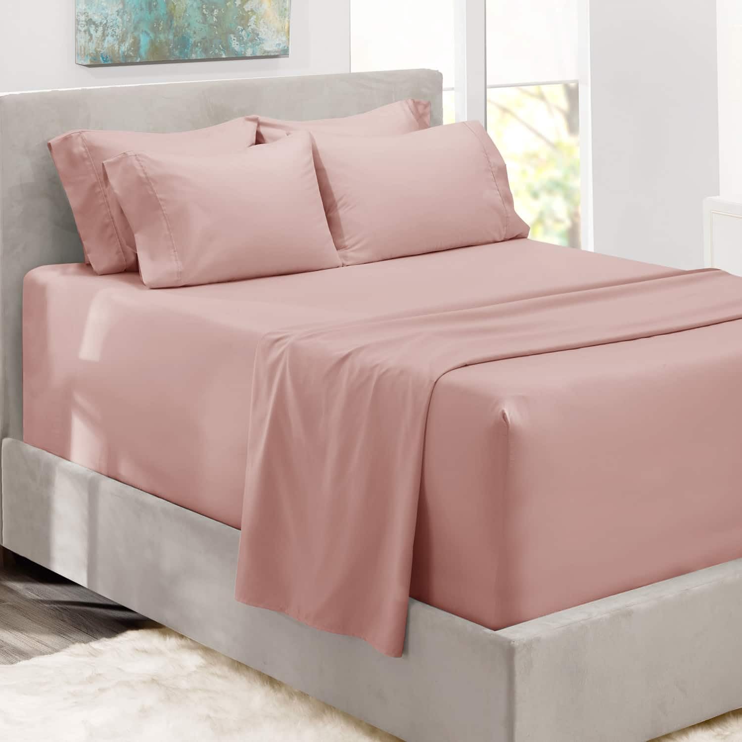 Microfiber Queen Size; Includes 1 extra deep pocket fitted sheet, 1 flat sheet and 4 pillow cases. Deep pocket fitted sheet measures 60 inches x 80 inches and fits mattresses 18-24 inches deep. Flat sheet measures 90 inches x 102 inches. Pillow cases measure 20 inches x 30 inches. Hotel-quality fitted bedding is woven from the highest quality microfiber material, double brushed on both sides for ultimate softness and comfort. Deep pocket sheets fit deep pocket 18 inch, 20 inch, 21 inch, 22 inch and 24 inch mattresses. These are the best sheets for extra tall & large mattresses Resistant to pilling and snagging, our sheets are pet-friendly and made to last. Our fabulous selection of vibrant colors won’t fade after washing. Fade, stain, shrink and wrinkle resistant. Machine washable in cold, dries quickly on tumble dry low temperature.
