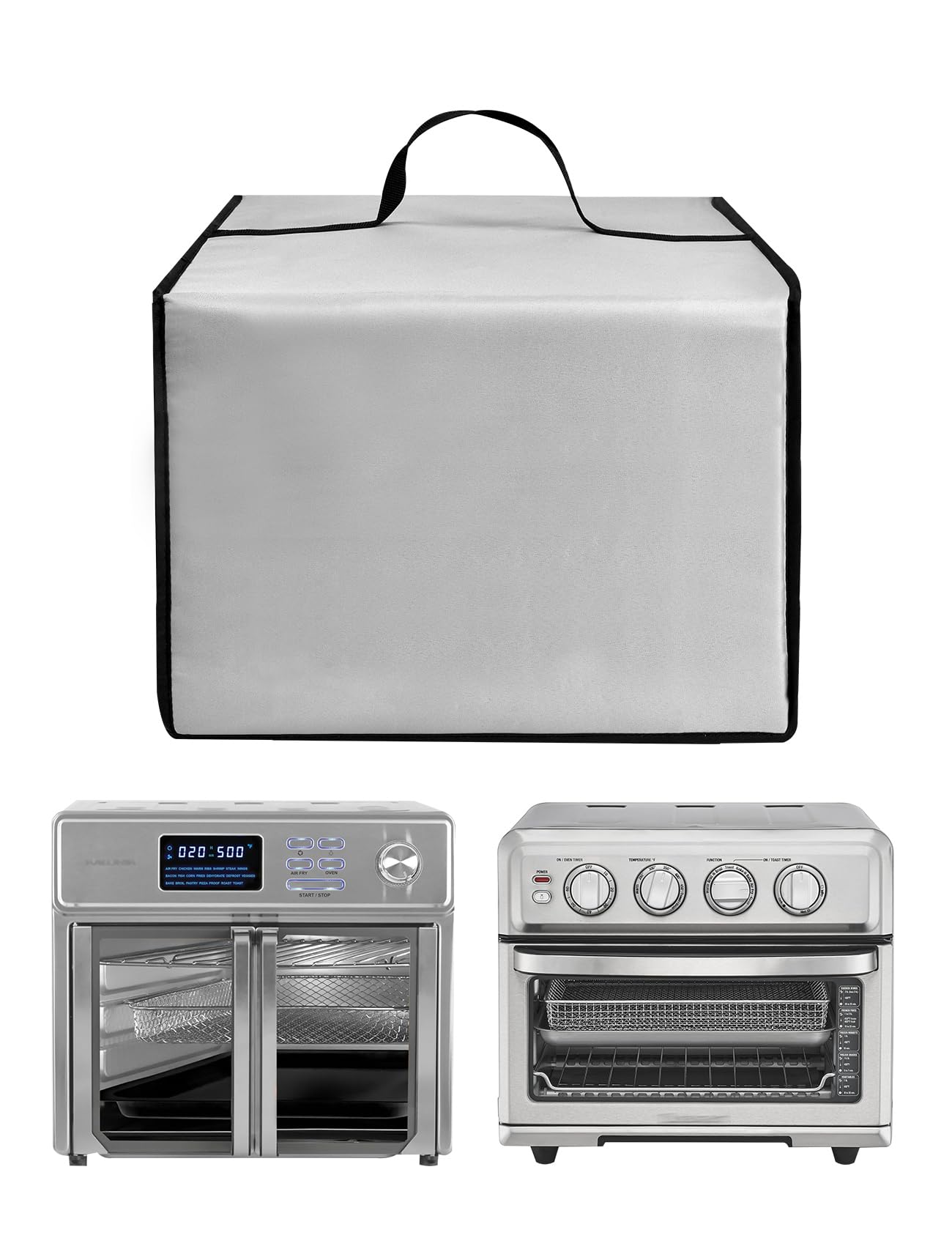 Air Fryer Cover Size is: 18.1"D x 14.6"W x 13"H(46x37x33cm), Dust cover for Cuisinart Air Fryer TOA-70/for Kalorik MAXX Digital Air Fryer Oven 26 Quart Convection Toaster Oven or other kitchen utensils; (please measure the size of air fryer before purchasing). Heat resistant Nylon:Air fryer cover is made of durable 600D nylon, which is dustproof, waterproof, scratchproof and anti-static; it can protect your air fryer from damage. Air Fryer Protect Case:Keep your kitchen utensils tidy and clean; avoid the inconvenience caused by dust, cooking steam or oil smoke; perfect for unused air fryers in restaurants and kitchens. Comfortable Handle:Cover handle is made of sturdy encrypted stitching, pick up the lid and slide it off the top of the air fryer to cover it; it is convenient to use and can be folded up for storage when not in use. Bottom Opening:The bottom opening design of the dust cover allows air circulation to prevent water stains from remaining on the air fryer, providing reliable protection for your equipment. Reusable:Dust cover is reasonably priced and reliable in quality. The waterproof cover is perfect for unused air fryers in kitchens and restaurants. Easy to clean:Wipe the cover with a damp cloth to remove stains; the cover can be hand or machine washed; it is not easily deformed after repeated washing. If you want to protect your fryer well, this dust cover is definitely your best choice.