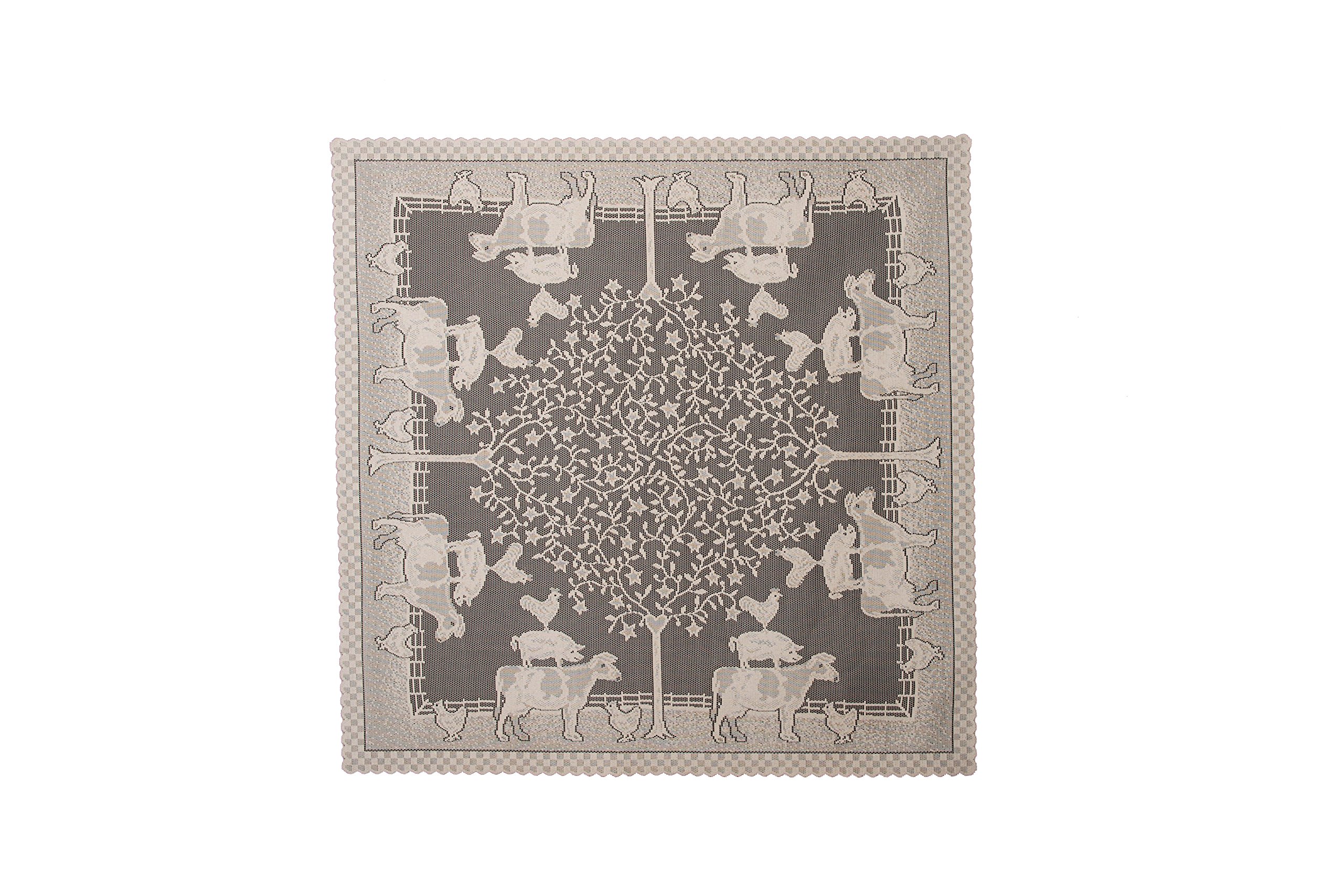 100% Polyester Made in US Table topper measures 42x 42 Made of 100Percent polyester Machine wash cold, gentle. Do not bleach. Lay flat or hang to dry. Touch up with cool iron if desired Features cows, Pigs & Chickens Perfect for any country decor