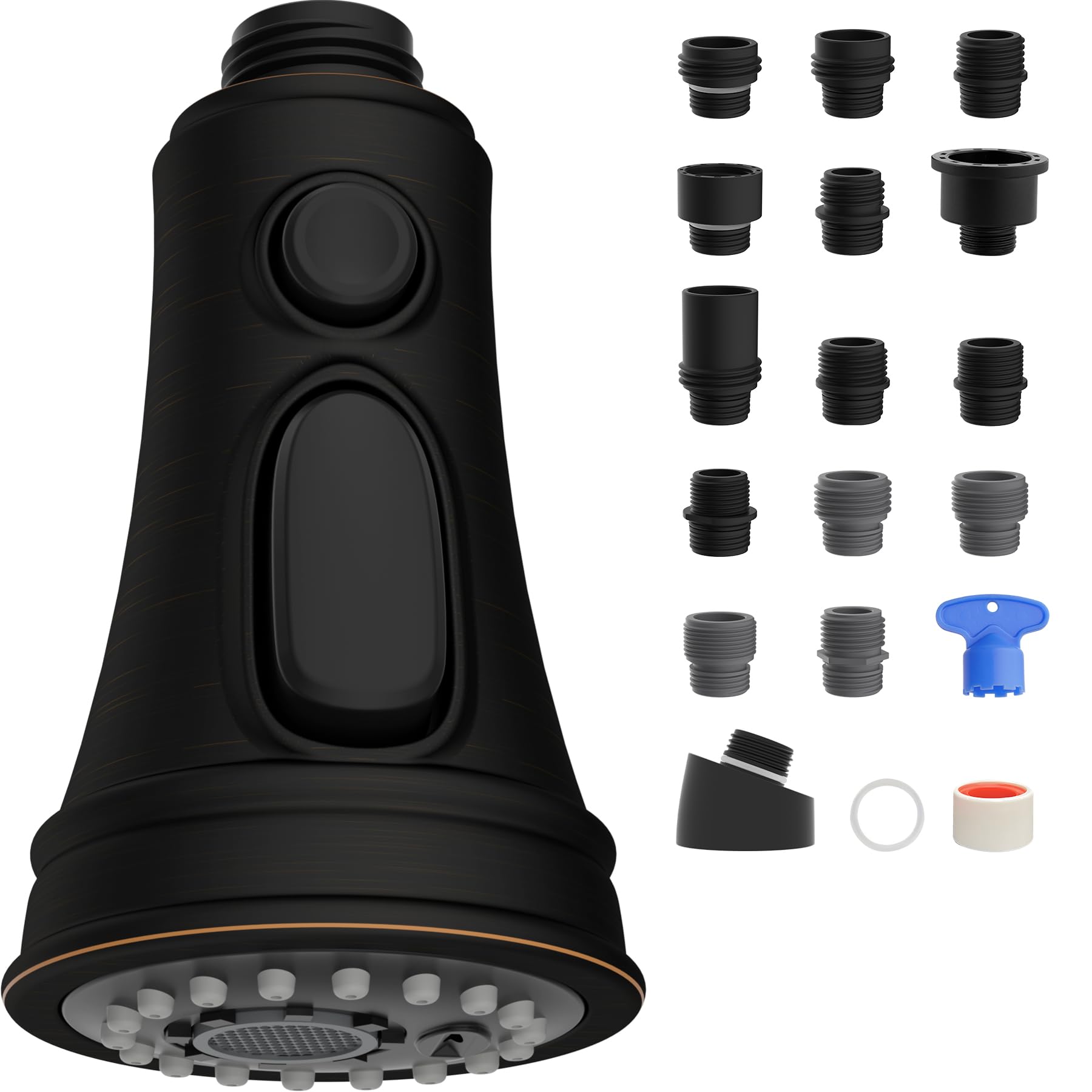 3 Function Kitchen Sink Sprayer: The kitchen sink faucet head features stream, spray, and high-pressure rinsing modes. The high-pressure rinsing mode delivers powerful water flow, making it easy to remove food debris with blade-like water. Use the stream and spray modes for daily cleaning tasks. Effortlessly switch between functions by pressing the button 15 Connection Sizes for Broad Compatibility: The faucet spray head replacement includes 15 adapters and is compatible with Moen, Delta, AquaSource, Kohler, Hansgrohe, and Grohe. It is not compatible with Pfister and Glacier. Key Note on Compatibility: It is primarily determined by the thread size of your faucet. Even for the above-mentioned compatible brands, a size mismatch will result in incompatibility. Please check the faucet size before ordering Removable & Washable Faucet Aerator: An aerator key is included for removing the faucet aerator. The interior multi-mesh aerator creates a quiet, no-splashing aerated stream, with most impurities being filtered out. The faucet aerator can be removed and cleaned to ensure clean water and continuous flow. Certified to NSF, cUPC, and low-lead standards, this faucet head adheres to strict health and performance requirements—ensuring safe water use and reliable functionality Premium Quality & Leak-Proof Performance: This pull-down kitchen faucet head replacement is crafted from engineering-grade plastic (PC/ABS) for durability. Its finish effectively resists daily rusting, ensuring long-lasting use and reliable quality. When installed correctly, the sprayer head delivers a tight seal with zero water dripping Easy Installation & No-Splash: No tools are required—installation is a breeze. Simply unscrew your old faucet head and replace it directly with this kitchen sink faucet replacement head. The water flow from this pull-down sprayer replacement head is consistent and stable, effectively preventing splashing 1. Package includes 15 different connection adapters, making this pull-down kitchen faucet spray head replacement compatible with major brands, including compatible with Moen, Delta, AquaSource, Kohler, Hansgrohe, and Grohe, etc. (Not including Pfister or Glacier) So it will meet your all requirements. 2. Provides 3 spray modes for you to choice, wide spray and aerated stream, and unique flushing modes, you just need to press the button to switch from stream to spray, or press the round button to change to the flushing, it will give you a comfortable operation experience.