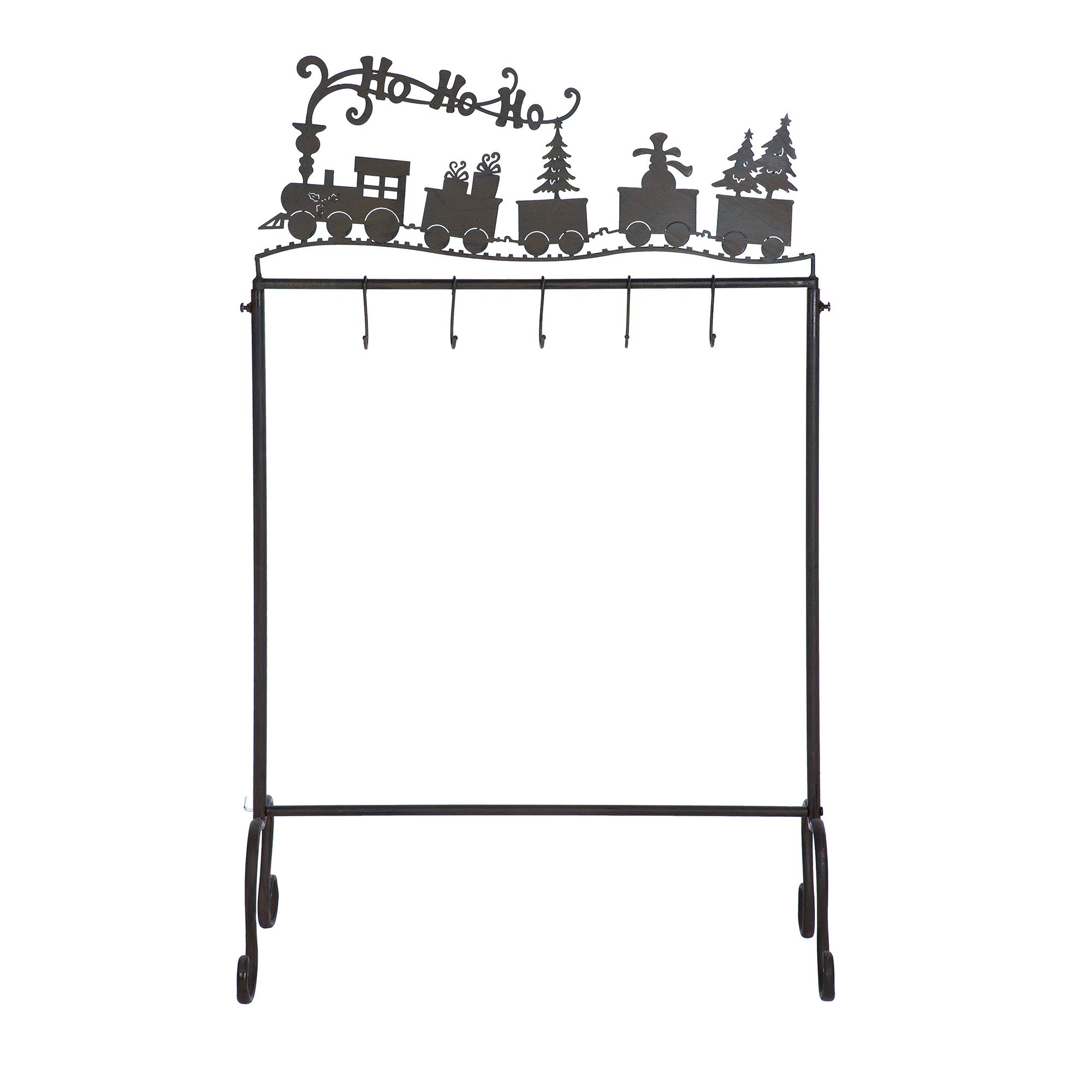 Ho Ho Ho Train Stocking Holder Stand features a train across the top of the stand that holds five hooks for stockings; Sentiment reads "Ho Ho Ho" Stocking Holder Stand is made of Iron Metal with Black finish; Truly festive functional and absolutely perfect for adding to any cozy home this holiday season Stocking Holder Stand measures approximately 27 X 11.5 X 45.25 inches; Brings joyful cheer to your decorating spaces Perfect alternative for displaying stockings so Santa can reach them Contained in protective packaging; Ready for easy gifting Transpac is an industry leader in gift, seasonal, and home and garden decor products. Our focus in on trend-forward designs created in partnership with some of the best designers and artists in the country. Ho Ho Ho Train Stocking Holder Stand features a train across the top of the stand that holds five hooks for stockings; Sentiment reads "Ho Ho Ho". Stocking Holder Stand is made of Iron Metal with Black finish. Stocking Holder Stand measures approximately 27 X 11.5 X 45.25 inches. Perfect alternative for displaying stockings so Santa can reach them. Ships in protective packaging.