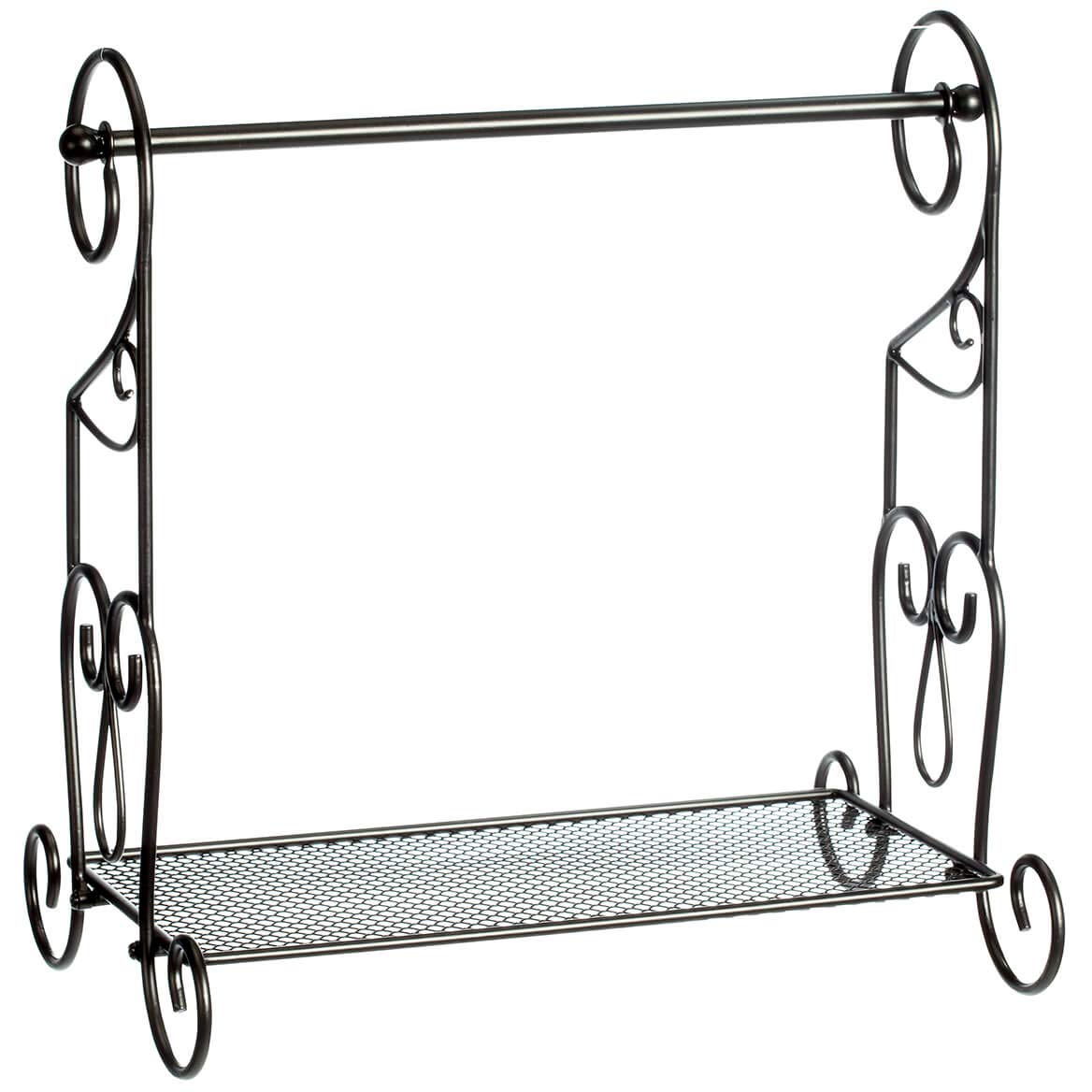 Freestanding paper towel organizer is a smart solution for any countertop, offering instant style and space-saving storage Crafted of durable scrolled metal with a classic black finish, its elegant design will be sure to complement any décor Features a screened shelf below for storing and displaying spices, potted herbs, condiments or your favorite collectibles in the kitchen Ideal for bathroom countertops as well; simply hang washcloths or hand towels on the horizontal towel bar and stock lotions, soaps and other toiletries on the bottom shelf Towel Rack and Organizer Stand measures approximately 14 inches long x 13 inches wide x 9 inches high overall WE’RE PROUDLY PART OF THE SILVER STAR BRANDS FAMILY: With a rich history of delivering quality and innovation, our trusted brands include Miles Kimball, Walter Drake, Easy Comforts, Exposures, Dream Products, and Native Remedies. From creating distinctive outdoor Gaggleville décor to offering convenient do-it-yourself will kits, we specialize in providing unique solutions that enhance lives, homes, and well-being. Our commitment to excellence ensures premium products for every customer need. This Home MarketplaceTM Kitchen Paper Towel Rack and Organizer has a removable bar ... and features a screened shelf below for storing and displaying spices, potted herbs, condiments or your favorite collectibles. Crafted of durable scrolled metal with a classic black finish, the freestanding paper towel organizer is a smart solution for any countertop, offering instant style and space-saving storage. Paper towel holder measures 14" x 13" x 9" overall.