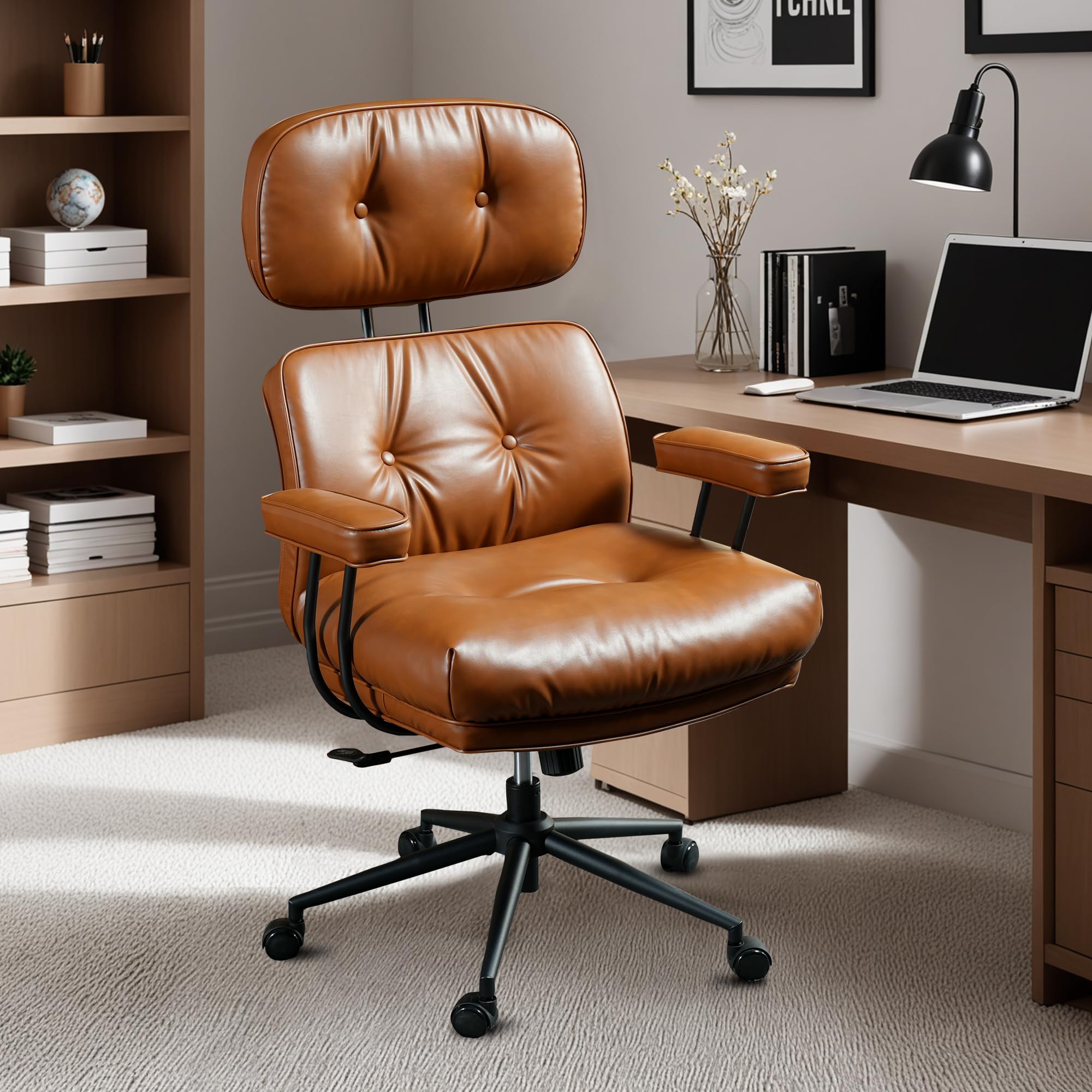 Ergonomic Comfort Chairs for Long Hours: Designed for extended use, this high-back chair provides full support for your head, lumbar, hips, and arms. The thickened cushioning ensures all-day comfort, whether you're working, studying, or gaming. With adjustable height and padded armrests, this comfortable office chair is ideal for professionals and home office users, offering ergonomic support to reduce back strain Stylish Mid-Century Modern Office Chair Design: Upgrade your workspace with the Ergonomic Home Office Chair, featuring a sleek mid-century modern (MCM) design. The rich black PU leather or soft suede fabric upholstery adds a touch of elegance, making it a perfect fit for home offices, gaming setups, or modern workspaces. Its vintage office chair aesthetic and decorative office chair appeal blend seamlessly with any decor Durable and Easy-to-Clean Materials: Crafted from premium PU leather or durable suede fabric, this chair is waterproof, breathable, and scratch-resistant. Perfect for daily use, it’s easy to clean and maintains its luxurious look, even in homes with pets or children. The black leather office chair finish adds a luxury office chair feel, while the sturdy metal base ensures long-lasting durability Heavy-Duty Construction with 300 lbs Capacity: Built to last, the home office chair features a robust metal base and a heavy-duty gas lift, supporting up to 300 lbs. The 5-star base and silent, scratch-proof casters provide stability and smooth mobility, making it a reliable choice for big and tall users. Its executive chair build quality ensures it stands out in both home office and corporate settings Customizable Comfort for Every Need: Enjoy personalized comfort with adjustable height settings and a 3-position tilt lock mechanism (92.1°, 106°, 119°). The wide seat design accommodates various sitting positions, while the padded armrests add extra comfort. Whether you need a computer chair, gaming chair, or task chair, this ergonomic office chair adapts to your needs. Easy to assemble in just 15-30 minutes, it’s ready to use right out of the box Transform your workspace with this stunning Mid Century Modern office chair that perfectly balances style and comfort. The high-back design features luxurious tufted cushioning throughout, providing comprehensive support for your head, lumbar region, hips, and arms during long work sessions. Wrapped in sophisticated brown PU leather, this chair offers both waterproof and breathable properties while resisting scratches from daily use. The robust construction supports up to 300 pounds, while the adjustable height and 3-position tilt lock mechanism (92.1°, 106°, 119°) let you customize your seating position for optimal comfort. The sleek chrome base with smooth-rolling casters ensures easy mobility across your office space. Assembly takes just 15-30 minutes, making it a practical choice for your home office. Whether you're working, gaming, or simply relaxing, this executive chair delivers the perfect blend of retro aesthetics and modern functionality.