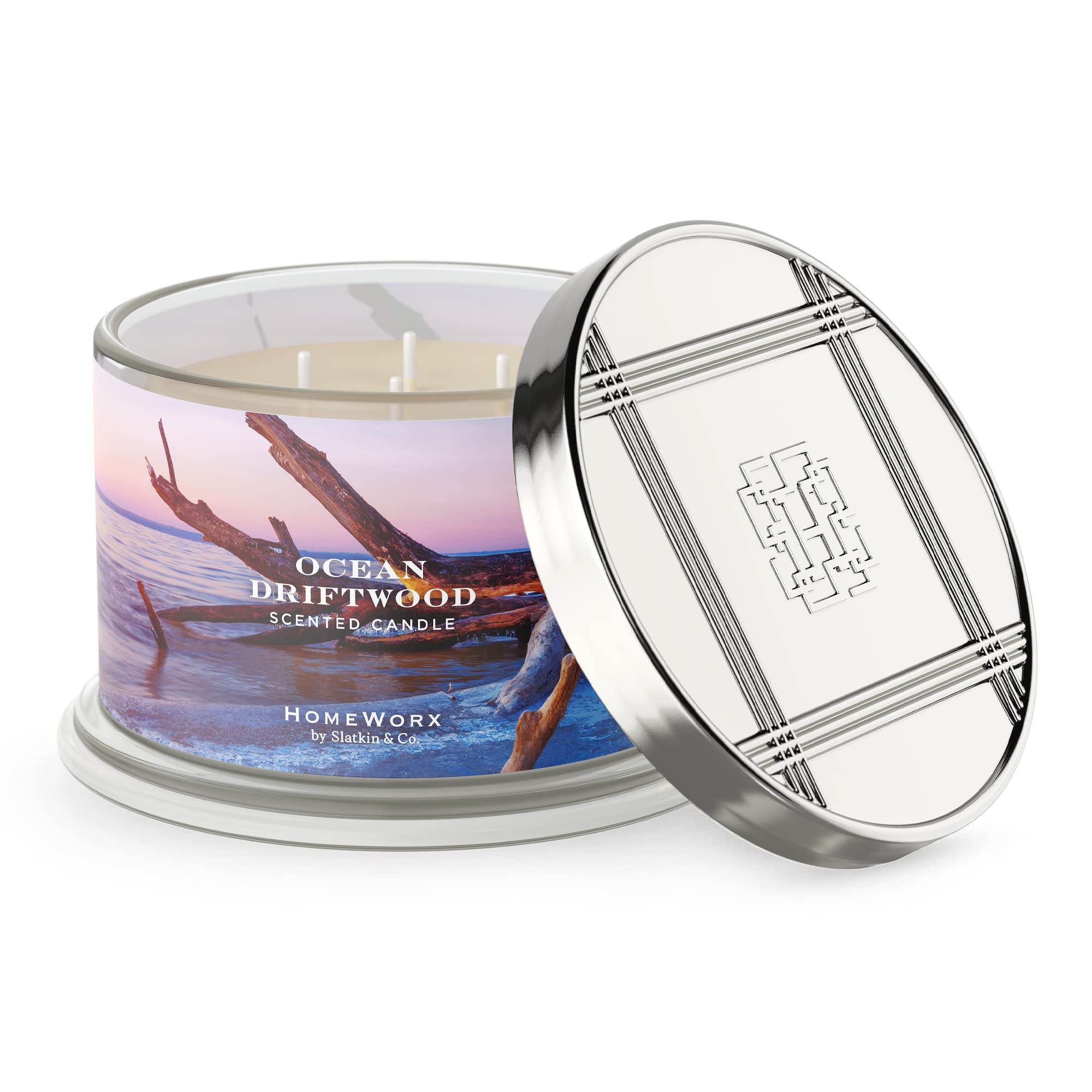 OCEAN DRIFTWOOD: Fragrant driftwood that has been bleached by the sun and sprayed by the ocean mist is combined with coarse sea salt and sea moss creating an aromatic moment that is clean and fresh. EXPERTLY FORMULATED CANDLES: Premium candles meticulously crafted with a blend of high-quality essential oils and optimized wicks, delivering a powerful scent throw that fills any room with long-lasting fragrance and a clean burn for 30-55 hours. VEGAN & CRUELTY-FREE: Made with a non-toxic, proprietary paraffin wax blend and safe fragrance ingredients, our scented candles are completely vegan and cruelty-free. HomeWorx candles burn clean and are safe for both you and your pets. THE PERFECT GIFT: HomeWorx by SLATKIN + CO. builds on 30 years of home fragrance experience making uniquely scented candles for a versatile and thoughtful gift for any occasion, perfect for creating a warm, inviting atmosphere on any occasion. IMPRESSIVE SIZE: HomeWorx by SLATKIN + CO. glass vessels are adorned by beautiful artwork and include a decortive metal lid to keep your candle fresh and dust free. The vessel are well balanced with a large base to keep them securly on your home surface. The HomeWorx by Slatkin + Co. 4-wick scented candle will bring an undeniable scent output to your home. Our candles are created with masterfully blended essential oils and optimized lead-free wicks that produce a clean burn while filling your home with beautiful fragrances. The Ocean Driftwood fragrance includes notes of sun bleached driftwood, ocean spray, coarse sea salt and sea moss. Shop a wide variety of HomeWorx by Slatkin + Co. fragrance products to enjoy throughout the year.