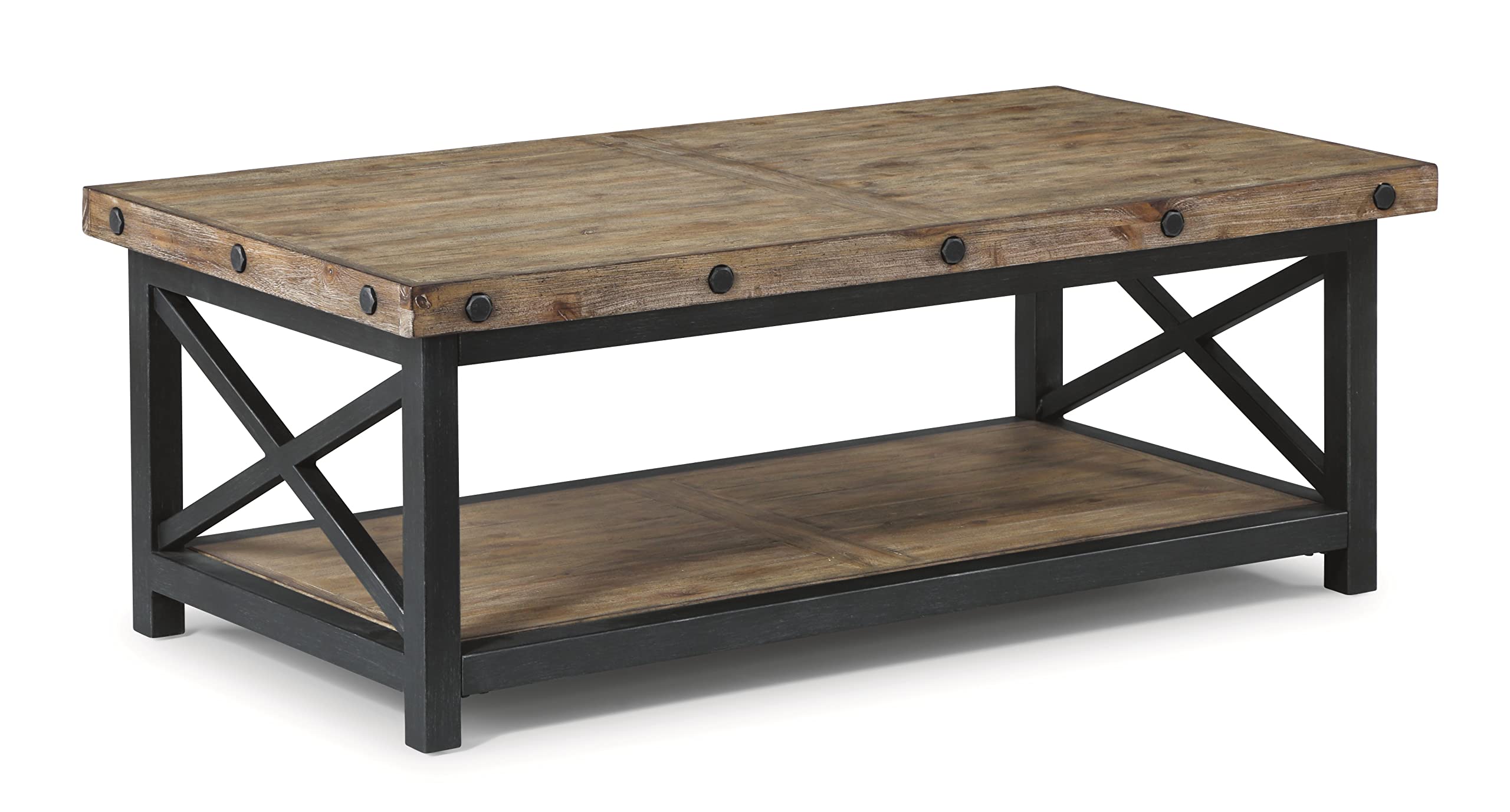 Modern rustic style in a light brown finish Crafted with solid and sustainable acacia wood Solid wood planks are distressed for a reclaimed wood look Hand-worked metal frame and exposed bolt heads Roomy top surface with lower shelf for additional storage