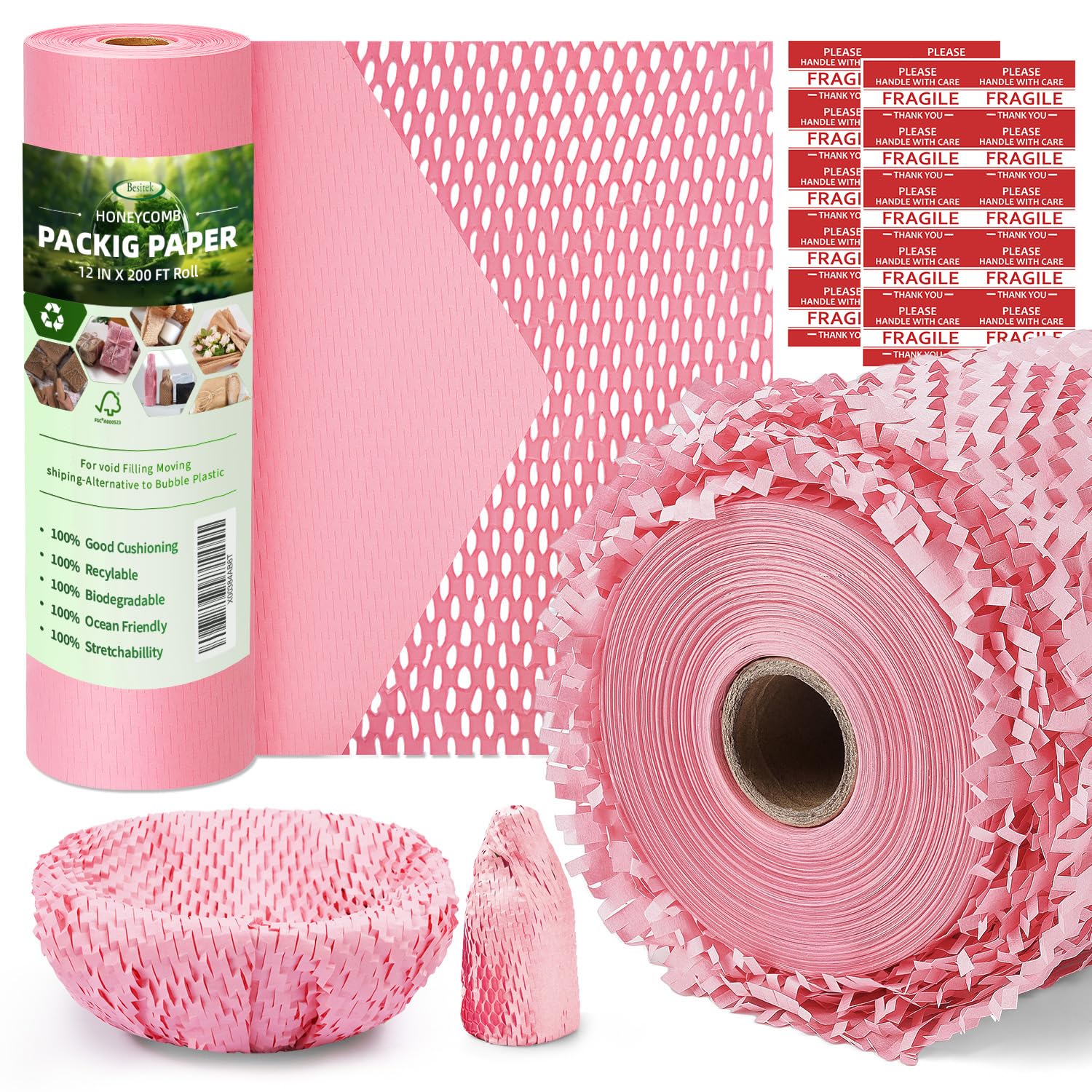 Environmental Friendly Packing Supplies :Eco friendly 100% biodegradable kraft paper, green alternative to plastic packaging materials .After stretching, the honeycomb structure can increase the cushioning performance and effectively protect the items that need to be wrapped. Great Packing Paper for Moving Breakables and Delicate Items: Without annoying tape or plastic wrap, the greenwrap packaging makes a confortable and clean look. The kraft brown packaging makes your products or gifts a simple but fine look, a good package material for small business. It's wildly used to wrap gifts, perfume, cosmetics, artwork, ornament, candles. Space saving: The packing paper with honeycomb structure made it can be stretched from 200 feet to 320 feet. 1.6 times longer after stretching. Use less money, get more filler, and space saving. Also you can get 20 Fragile Sticker labels, to keep your boxes safe during transportation. Easy to use: The honeycomb wrapping paper has a perforated design, which can be torn off without scissors or other tools, which improves the packaging speed. Creat a Clean Packaging Look: Wide usage honeycomb wrap . Not only can be used for moving, shipping, mailing, but also can be used for gift wraping. The natrual kraft color and cutting makes an elegant and clean look.1-year warranty Any questions about the product, please feel free to contact us! Product Features: