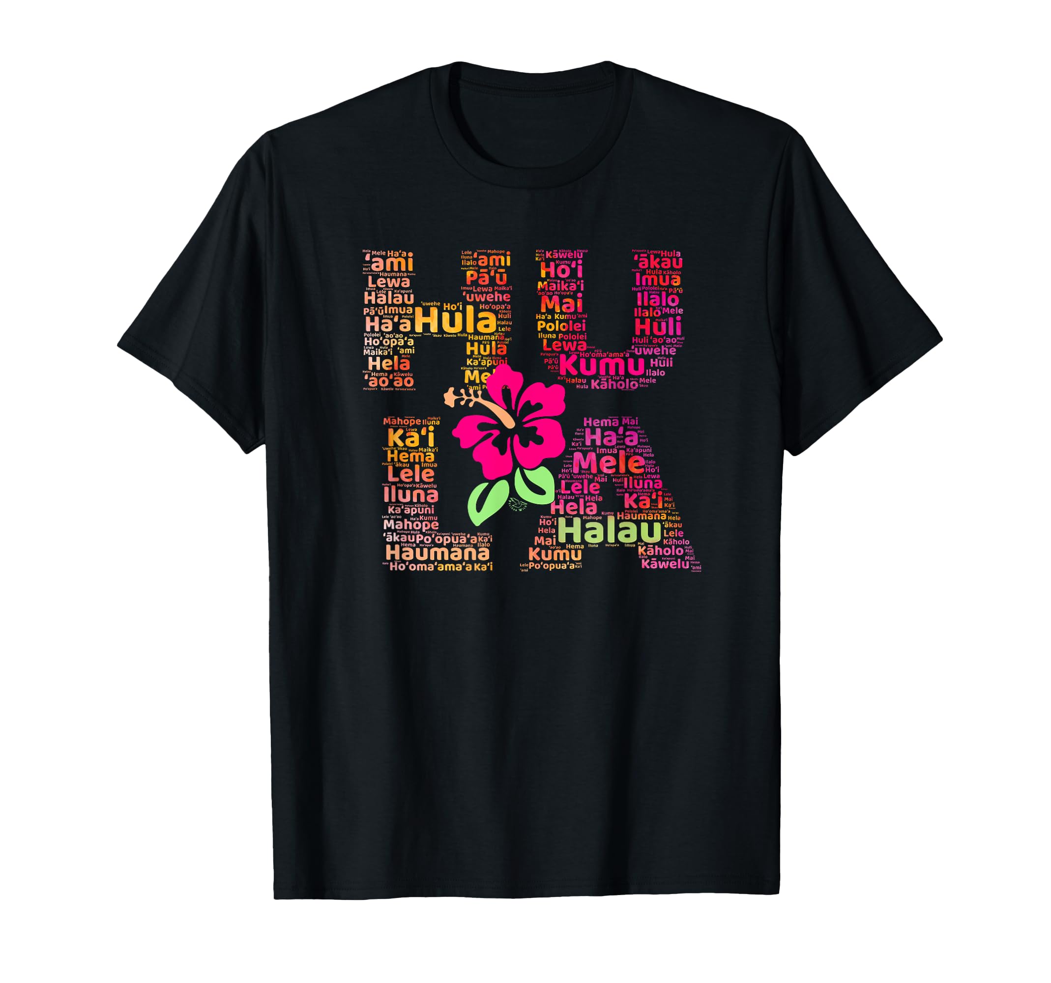 The design features a tropical hibiscus flower and a word cloud of Hawaiian hula dance steps and other terms such as Halau, Kumu Hula, Haumana, Mele, Lewa, Kaholo, 'Uwehe, 'Ami and others. A unique gift for a hula dancer, kumu or haumana. Also great as a Hawaii honeymoon keepsake or holiday souvenir from Aloha State and the Hawaiian Islands. Lightweight, Classic fit, Double-needle sleeve and bottom hem