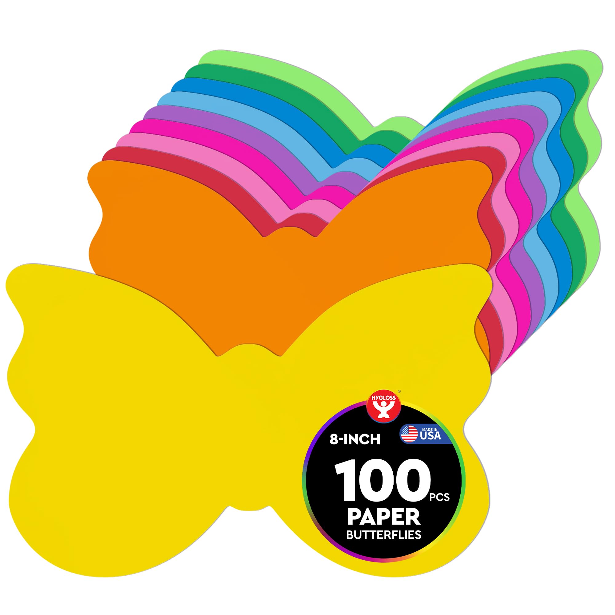 HIGH-QUALITY BUTTERFLY CUT-OUT - Made from premium quality paper in assorted vibrant colors, these butterfly cut-outs offer endless possibilities to enhance your classroom, home, office & more! Each cut-out comes pre-cut & measures 8” wide x 5" high, with 100 butterfly shapes in each pack. Convenient, easy to use, & a perfect finishing touch! A VARIETY OF FUN USES - A fun butterfly shape that can be used in a multitude of ways: classroom activities, snazzy bulletin boards, displays, doors, educational projects, parties, signs, home decor, spring-themed crafts, you name it! You can also incorporate the butterflies in your Hungry Caterpillar activities & bugs units. CREATIVE OPTIONS ARE ENDLESS – This variety pack of butterfly cut-outs gives you plenty of options to unleash your inventiveness. Decorate these quality acid-free paper shapes with paints, markers, colored pencils, glue, glitter & more! Introduce the concept of symmetry, teaching kids to decorate both halves of the butterfly symmetrically. ENHANCE SPRING FUN - These festive paper butterflies are perfect for crafts or customizing your own notes or cards. They are also great for kids to personalize as their own locker or cubby tag. These butterflies are an ideal way to encourage children's creativity & skills to soar! MADE IN THE USA - Hygloss Products Butterfly Shape Cut-Outs are proudly made in the USA. Each cut-out comes pre-cut & measures 5" wide by 8" high, with 100 Butterfly tree shapes per pack