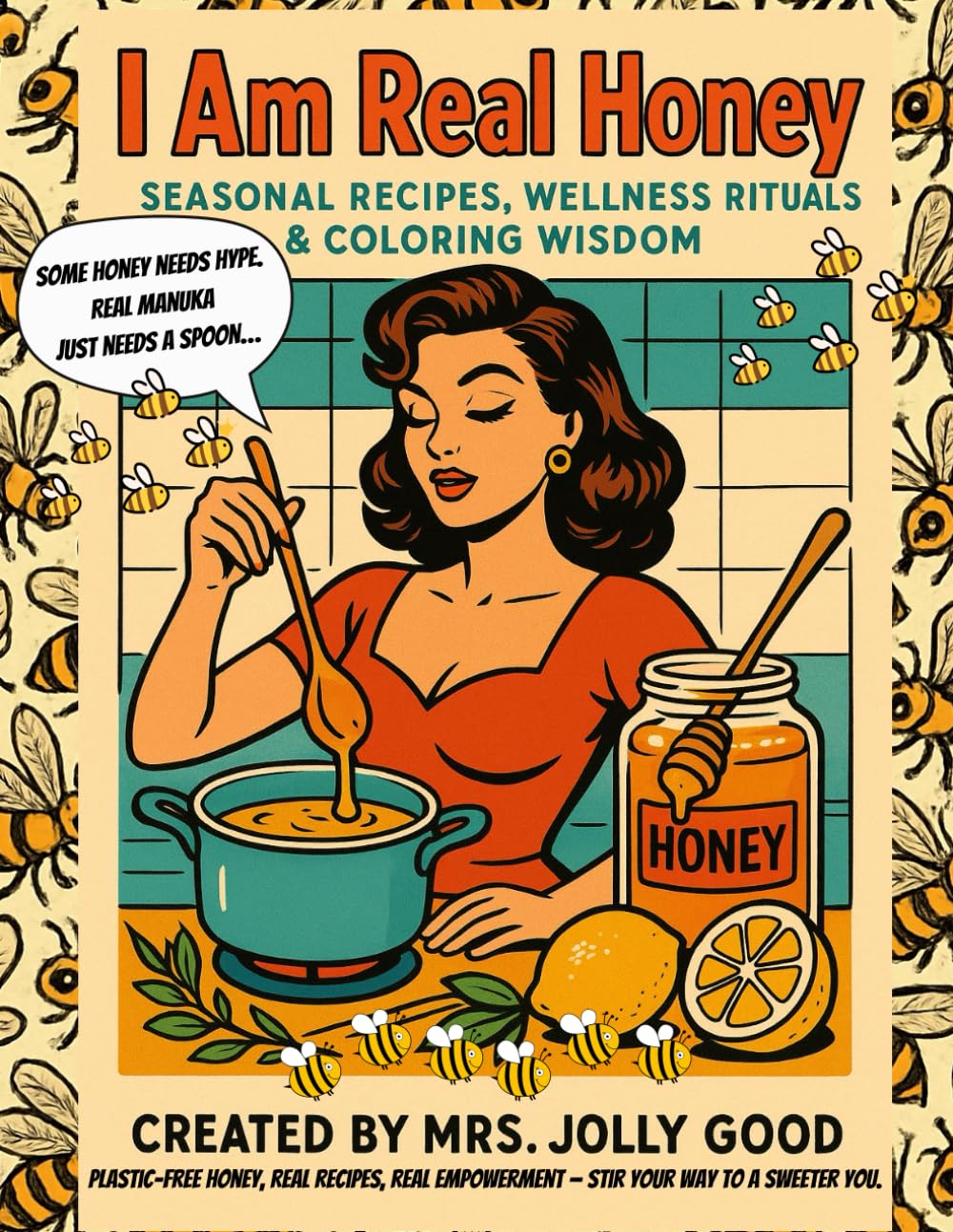 Discover the sweeter side of wellness with I Am Real Honey … a playful, beautifully illustrated blend of Manuka honey recipes, seasonal rituals, and creative coloring pages. Created by Mrs. Jolly Good, this book brings together everything honey lovers adore: - Easy, nourishing Manuka-based recipes - Cozy seasonal rituals and self-care ideas - Fun retro-style coloring pages - Natural wellness tips - Real, plastic-free honey inspiration Whether you’re stirring warm Manuka into a winter drink, whipping up a healing honey blend, or coloring away stress on a Sunday afternoon, this book is designed to help you slow down and reconnect with what’s real. Perfect for: • Honey lovers • Manuka honey shoppers • Wellness seekers • Coloring fans • Anyone who wants a little sweetness in their day Stir your way to a calmer, brighter, sweeter life … one spoonful (and one page) at a time.